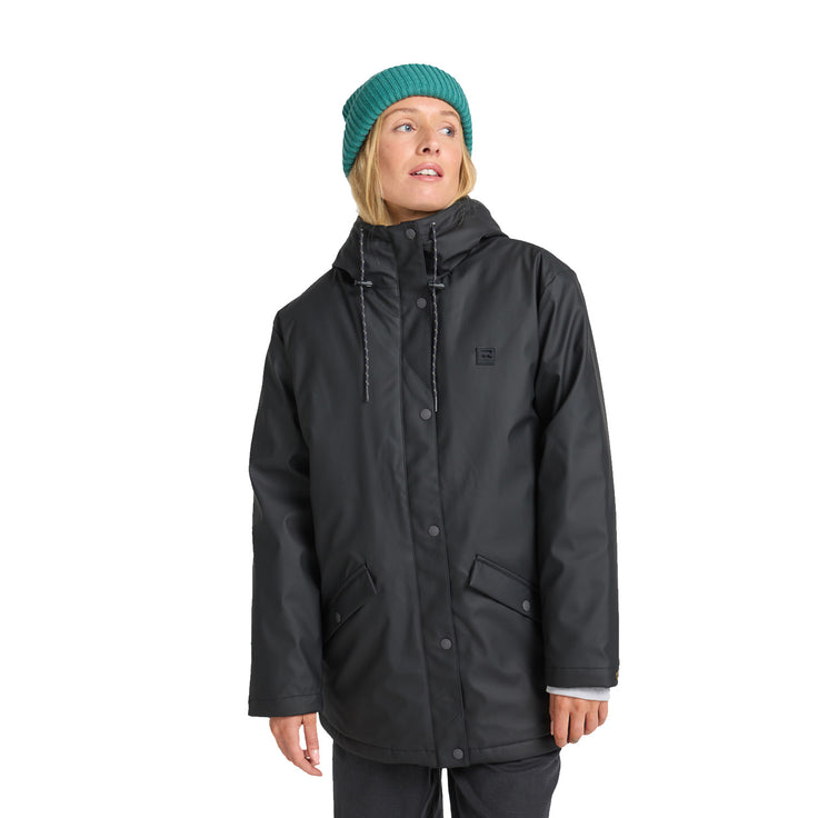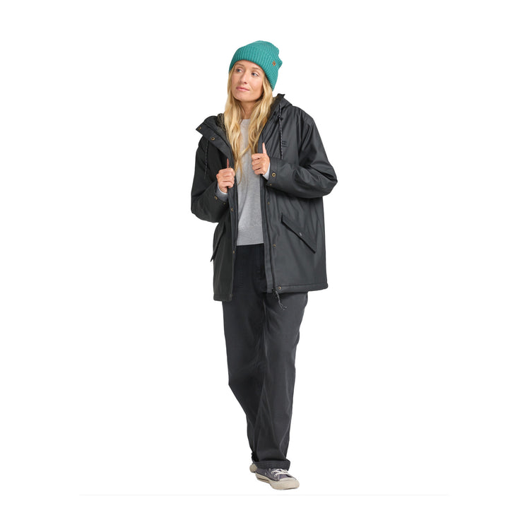 Veste imperméable, capuche ajustable, fermeture zippée et poches latérales.