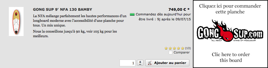 En résumé, la planche a l’air joueuse et nerveuse mais aussi rassurante et polyvalente. Je n’ai pas eu l’occasion de tester d’autres GONG, mais je pense que la NFA est un excellent choix pour mon usage ( premiers pas en surf dans les vagues de mediterrannée et quelques balades tranquilles d’1 h ou 2 quand c’est calme, à condition de ne pas être trop manchot et d’avoir déjà quelques heures de SUP ).