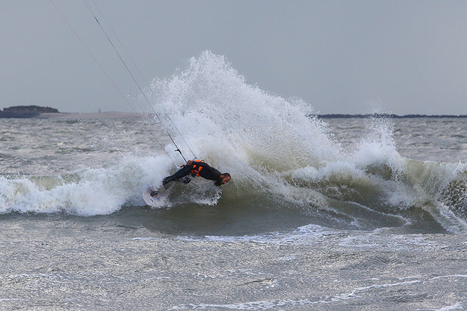 Kiteboarder : l’Ours en GONG Kite 5’0 Catch Corkarbon et aile GONG Kite Draw.