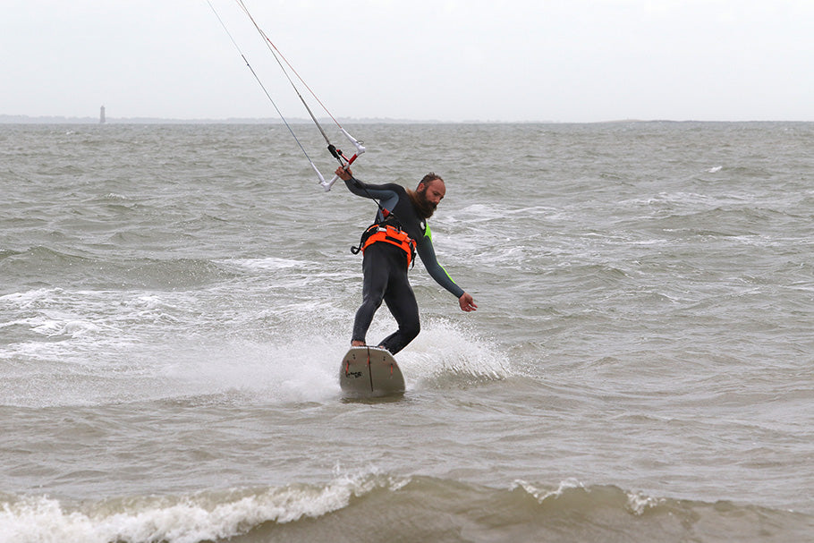 Kiteboarder : l’Ours en GONG Kite 5’4 Catch Bamby et aile GONG Kite 9m strutless green.