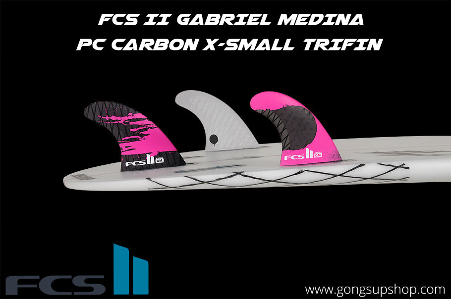 FCS II GM PC Carbon x-small tri fin : ce set au shape très polyvalent et à la construction ultra haut de gamme conviendra à toutes les conditions sur la grande majorité des planches.