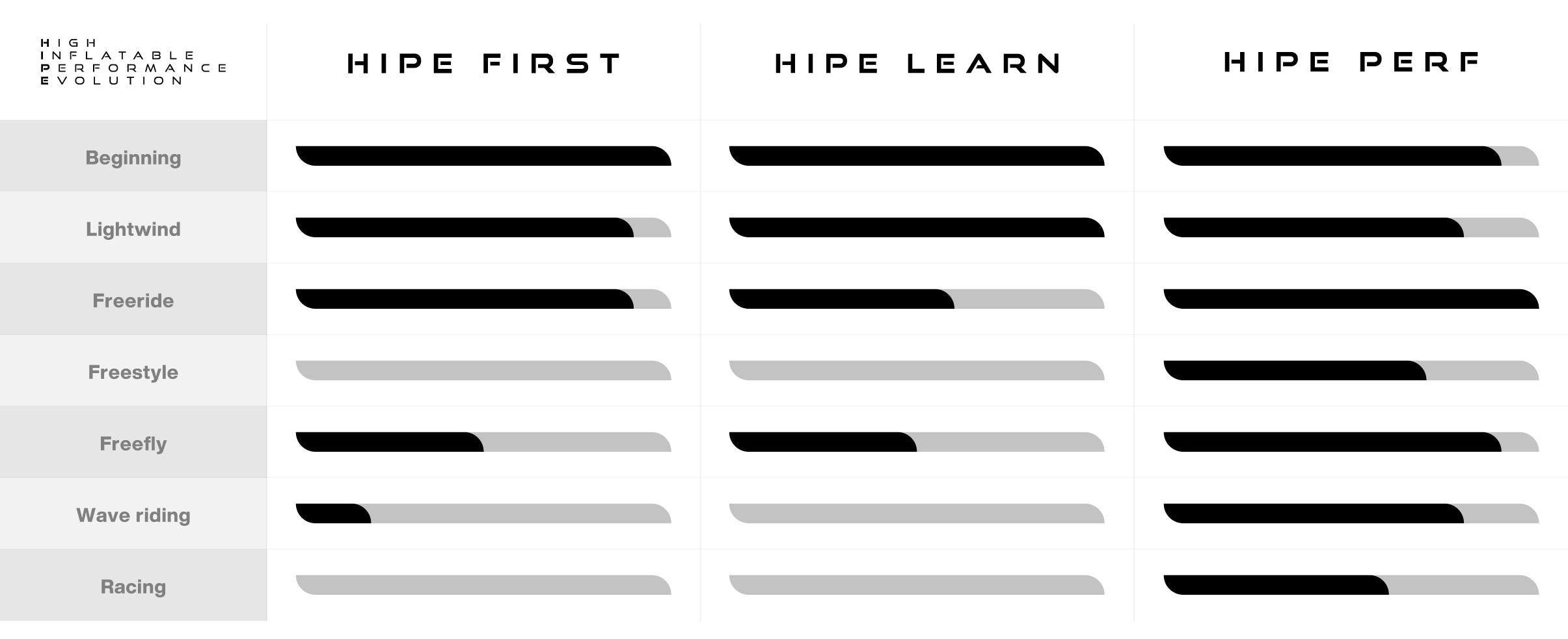 • HIPE Learn : Parfaite pour les débutants qui veulent d’abord naviguer sans l’obligation de voler, la HIPE Learn combine volume et stabilité pour offrir un apprentissage progressif. Idéale pour se familiariser avec le foil en toute sécurité.