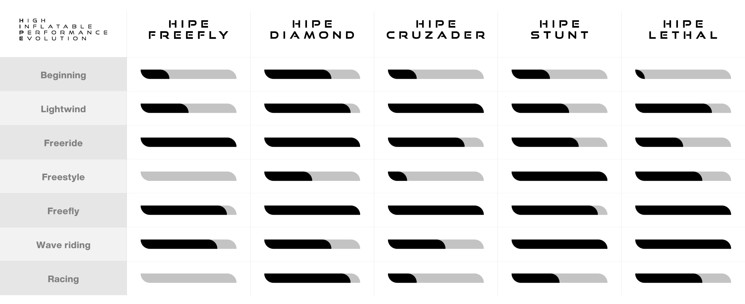 • HIPE Cruzader : Grâce à son shape allongé et à sa glisse optimisée, la HIPE Cruzader est le choix parfait pour maximiser les sessions dans les conditions de vent léger. Sa rigidité permet de partir au planning rapidement.