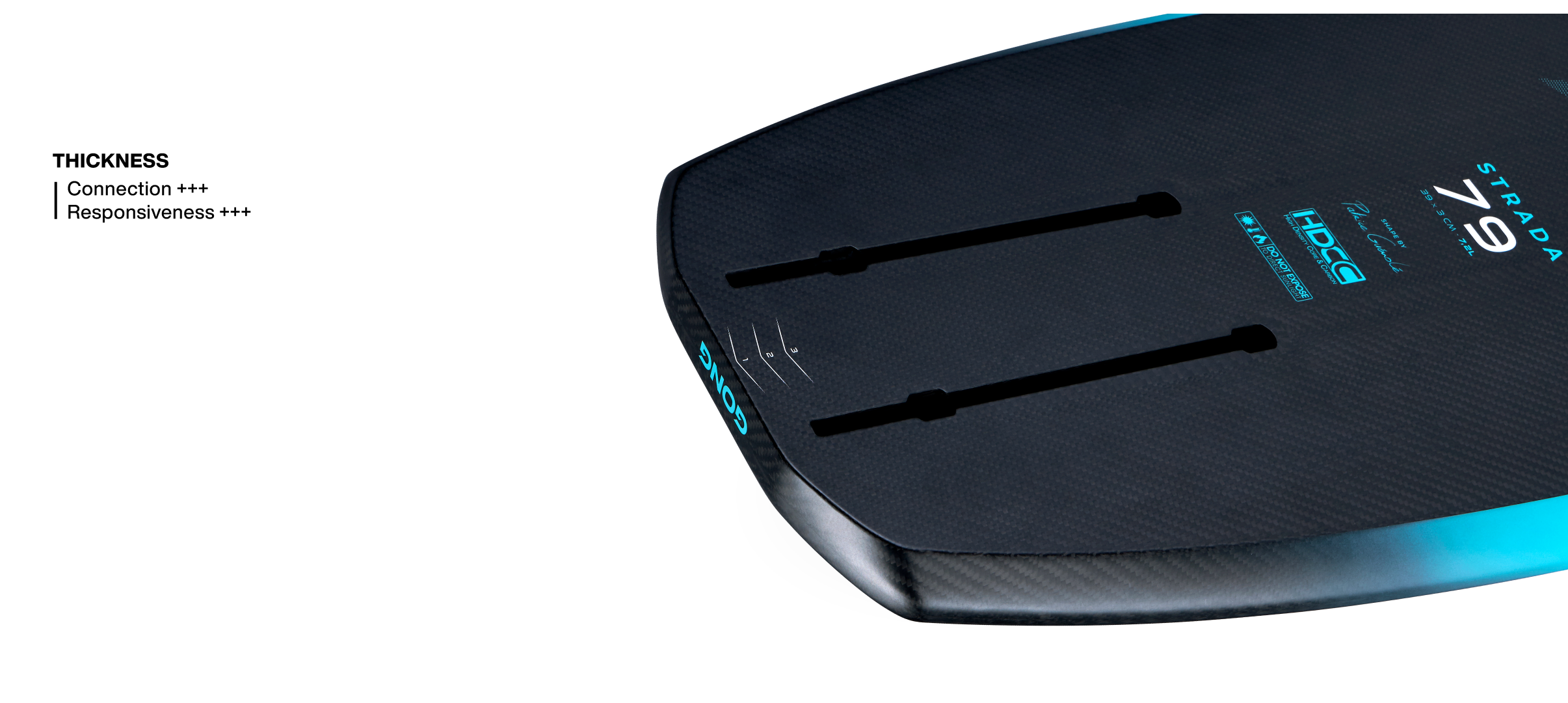 The HDCC (High Density Core & Carbon) construction puts the Strada at the top: it meets the same standards as the highest-performing models, with the added benefit of performance-oriented reinforcement. Three H-shaped carbon battens lock in rigidity, a unidirectional carbon strip on the deck reinforces longitudinal stiffness, the lamination is full prepreg carbon, and the full carbon SCS double-entry boxes are integrated into a structure pressed in a steel mold and then cured at 155°C . This is what gives the feeling of total power transmission: no unwanted flex, no losses, all the energy goes to the foil, and the geometry remains stable over time.