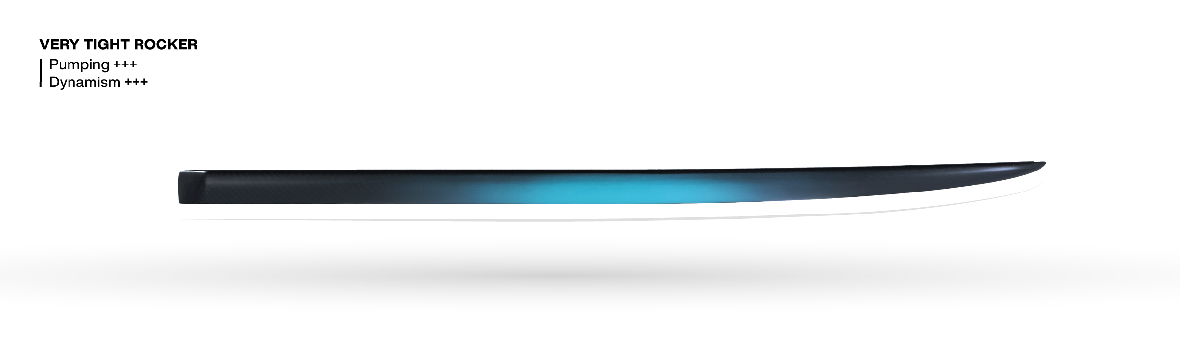Its rocker is extremely flat : just enough forgiveness to avoid being penalized by the slightest touch, but not a millimeter more. The idea is simple: less rocker equals more precision, more speed, less loss of momentum, and a board that remains taut at the front. When you barely touch, the board isn't designed to be forgiving with softness; it forgives with its efficiency, limiting the braking and allowing you to continue accelerating.