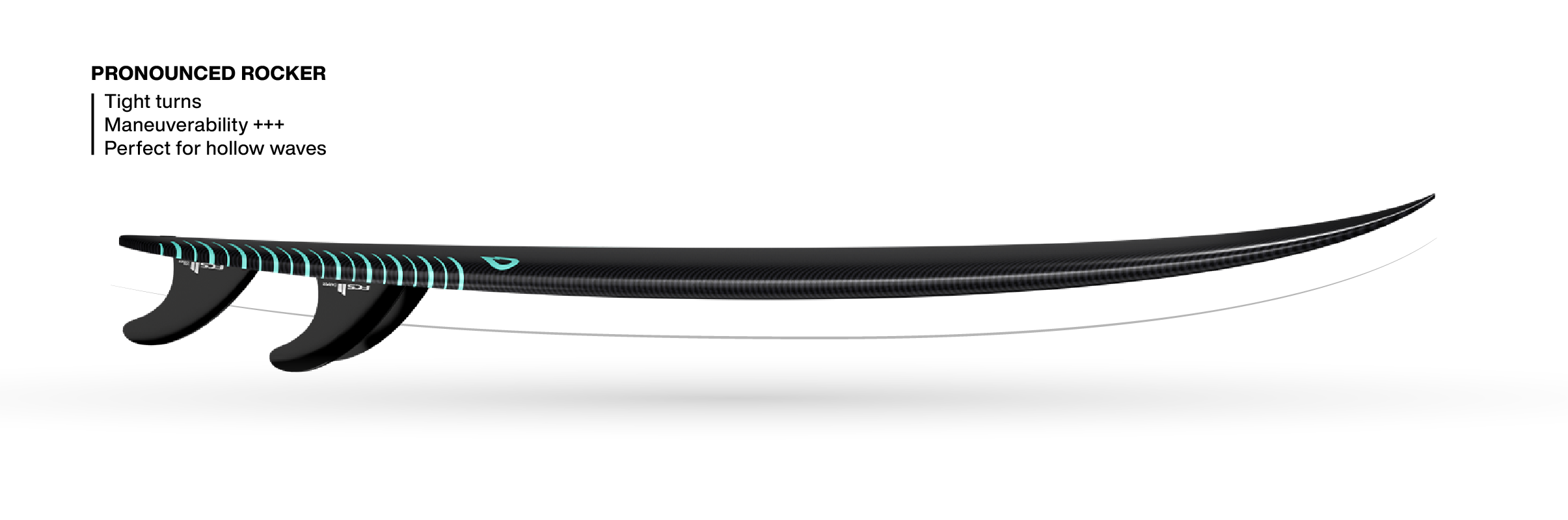 Significant but conventional rocker for a performance shortboard. Sufficiently pronounced at rocker’s start to avoid the slightest fault at the end of a top turn. The rocker remains constant all the way to the tail exit for the best possible maneuverability and strong curves. Rocker is both constant and well-balanced between nose and tail.