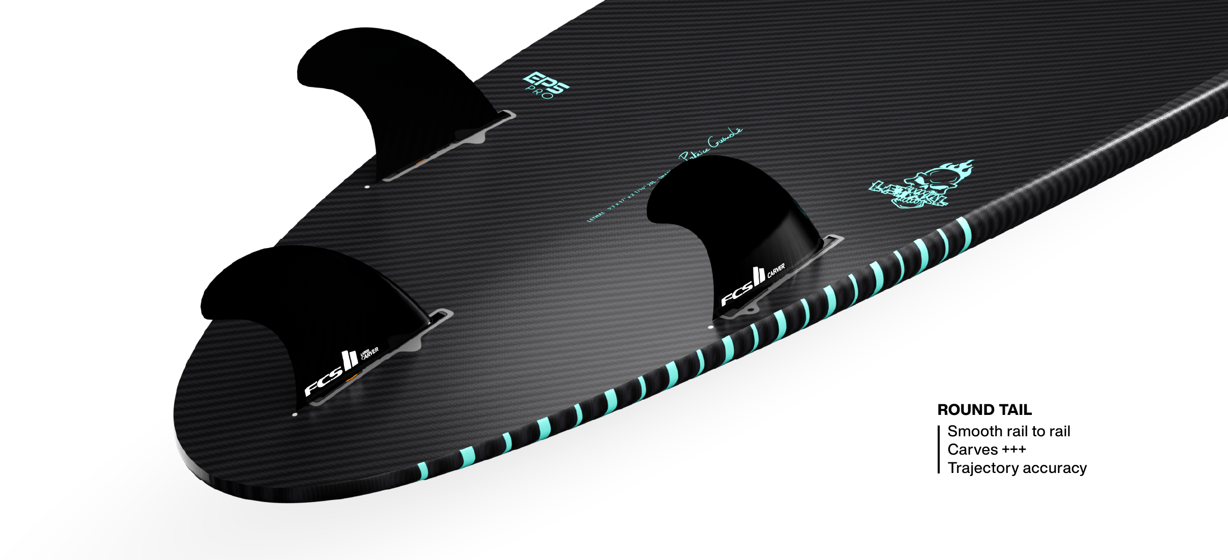 The round tail offers the greatest maneuverability. The round tail is positioned between the gliding squash tail and the sharp pin tail. It's a great choice for turning in waves that are pushing hard. Perfectly suited to tight maneuvers and fast pivots, it remains ultra-fluid.