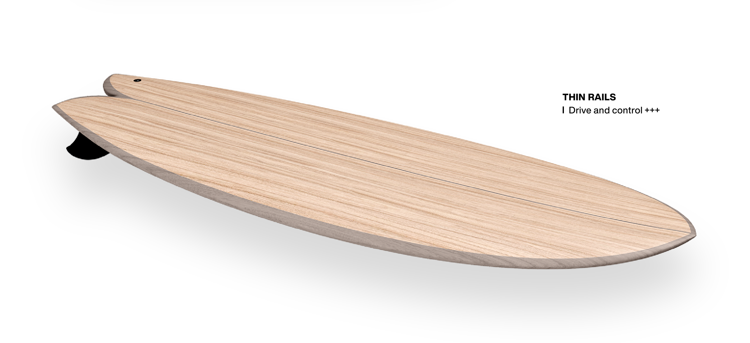We keep the traditional Keel fins to preserve what works on this shape. This pair of fins minimizes drag to deliver maximum speed and that characteristic feeling of freedom underfoot, typical of the 'loose' feel of a fish. Their long base adds width to the turns while ensuring control and stability.
