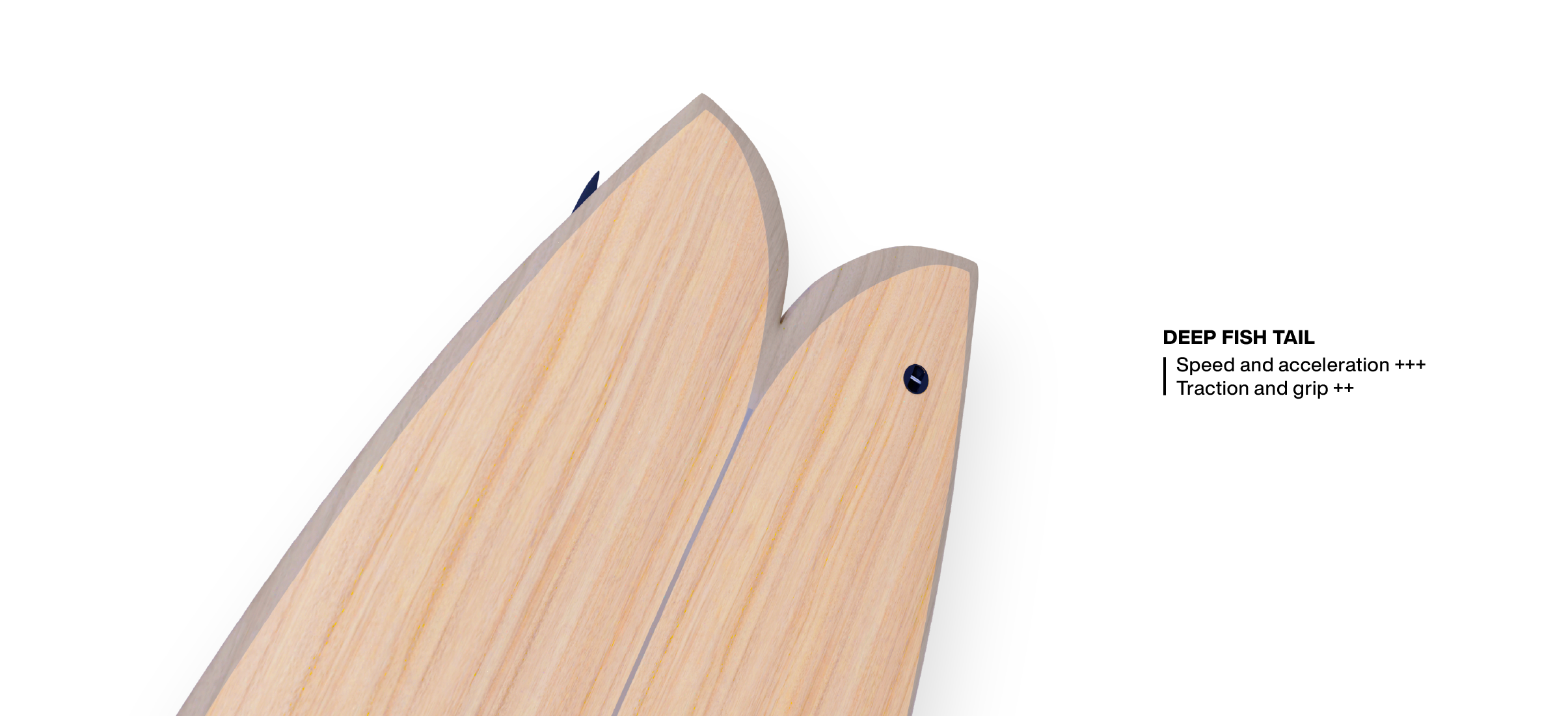 The Pie's deep fish tail provides excellent planing surface and great speed. In addition to offering stability, this tail delivers strong drive, making it incredibly easy to maintain speed no matter the section.