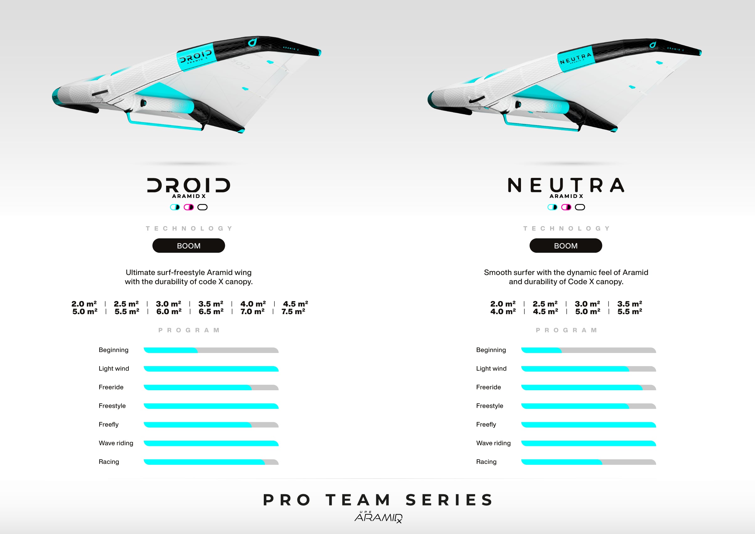 Quite simply, the Droid is the most compact wing in the range. It has the shortest wingspan and the smallest overall size. It has a bit more boom, so it’s less rectangular, slightly squarer. In 2026, its outline became rounder, less oval.