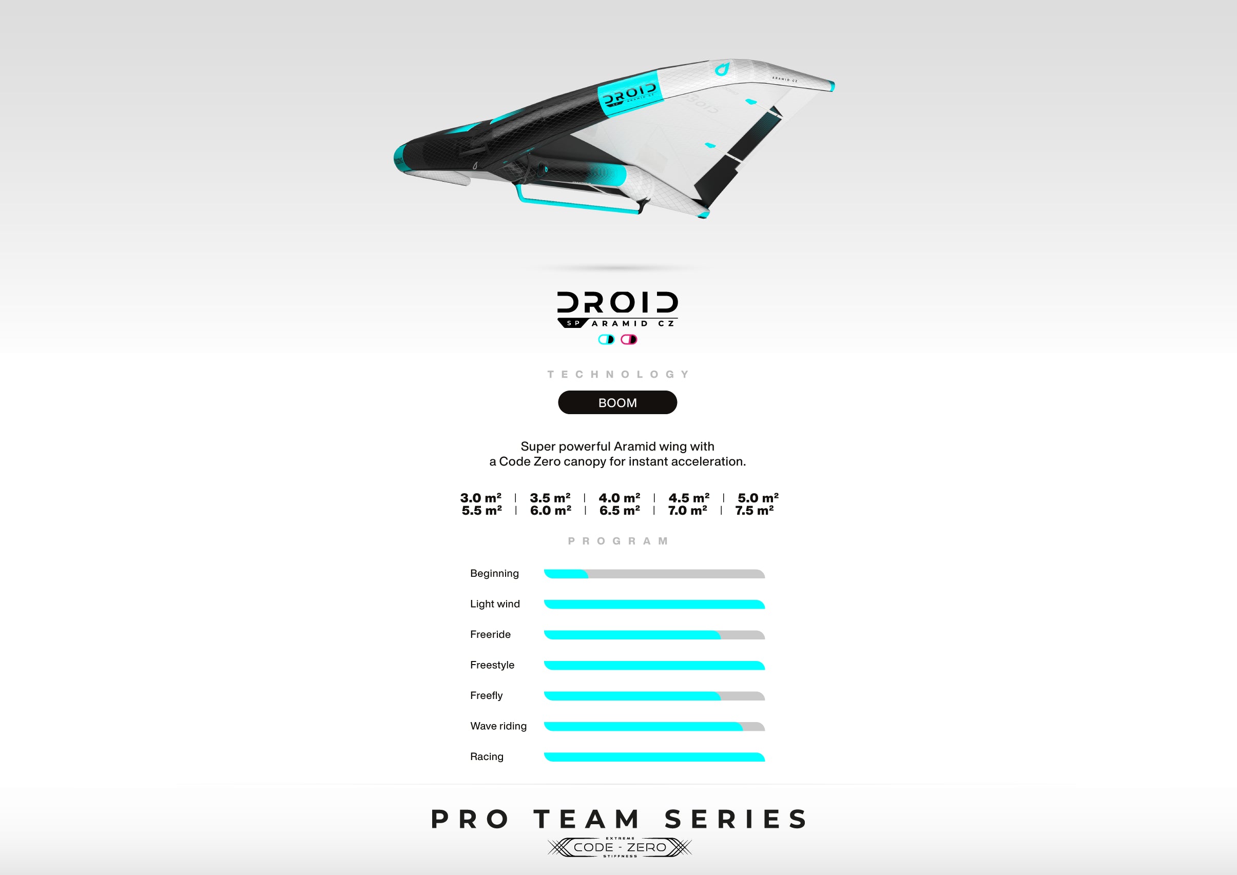 But if we talk about versatility at a high performance level, that’s different. The Droid offers enormous versatility, but always with power. This wing is built for acceleration, relaunching, and solid pull. It drives forward, it pulls, and behind that, it can do everything: ride waves, race a World Cup slalom, win a freestyle world championship, and a slalom world championship… So here, we’re talking absolute versatility, but in performance mode. You jump, you turn, you go fast, it can do it all.
