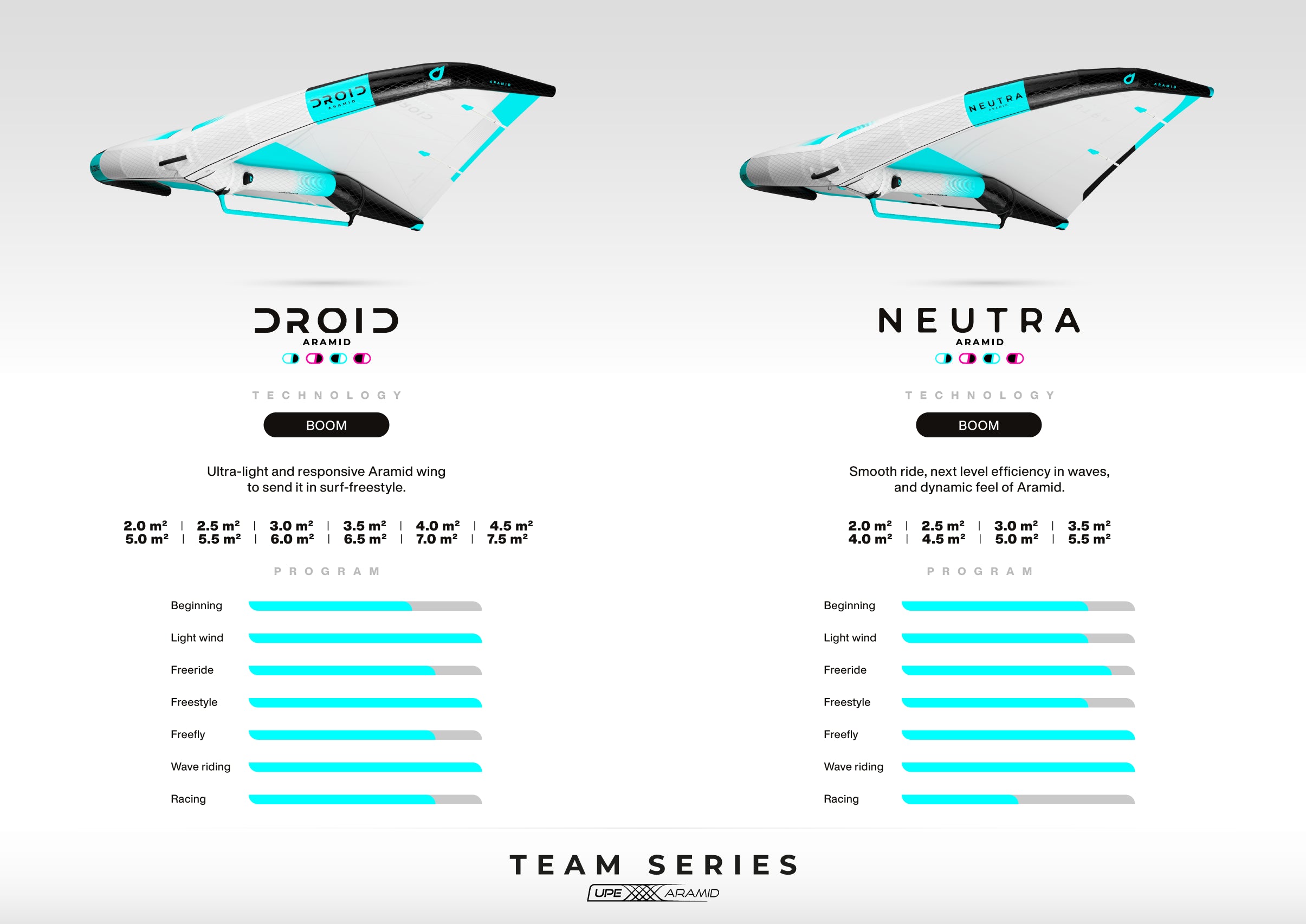 - Team : uses UPE Aramid – twice as light and five times as rigid. This allows higher inflation pressure and almost zero stretch in the material. The result is a wing that is sharper, more direct, more precise, lighter in hand, sleeker, and more agile. It keeps a bit of tolerance for pumping, so it’s still manageable, but it responds faster and more dynamically.