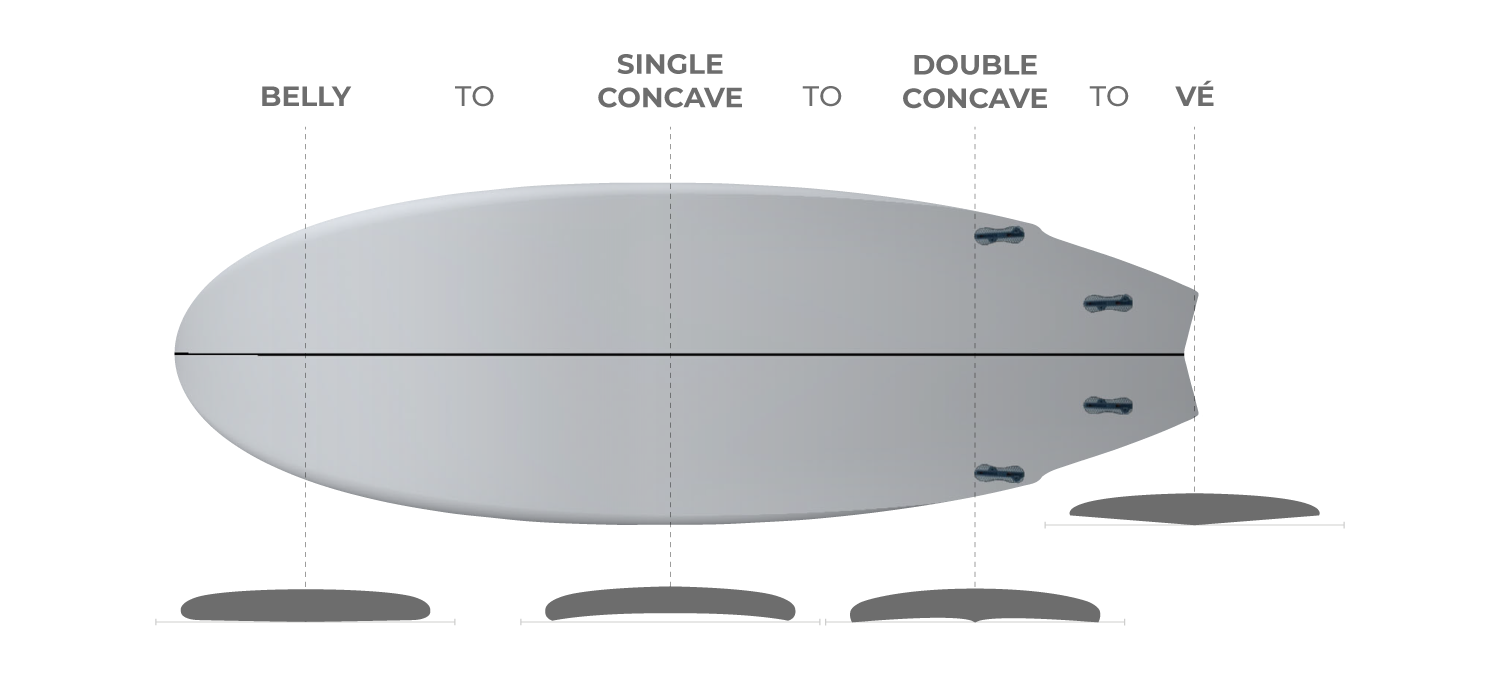 • A slight V with a double concave at the tail to release the flow of water while giving the board a loose rail to rail.