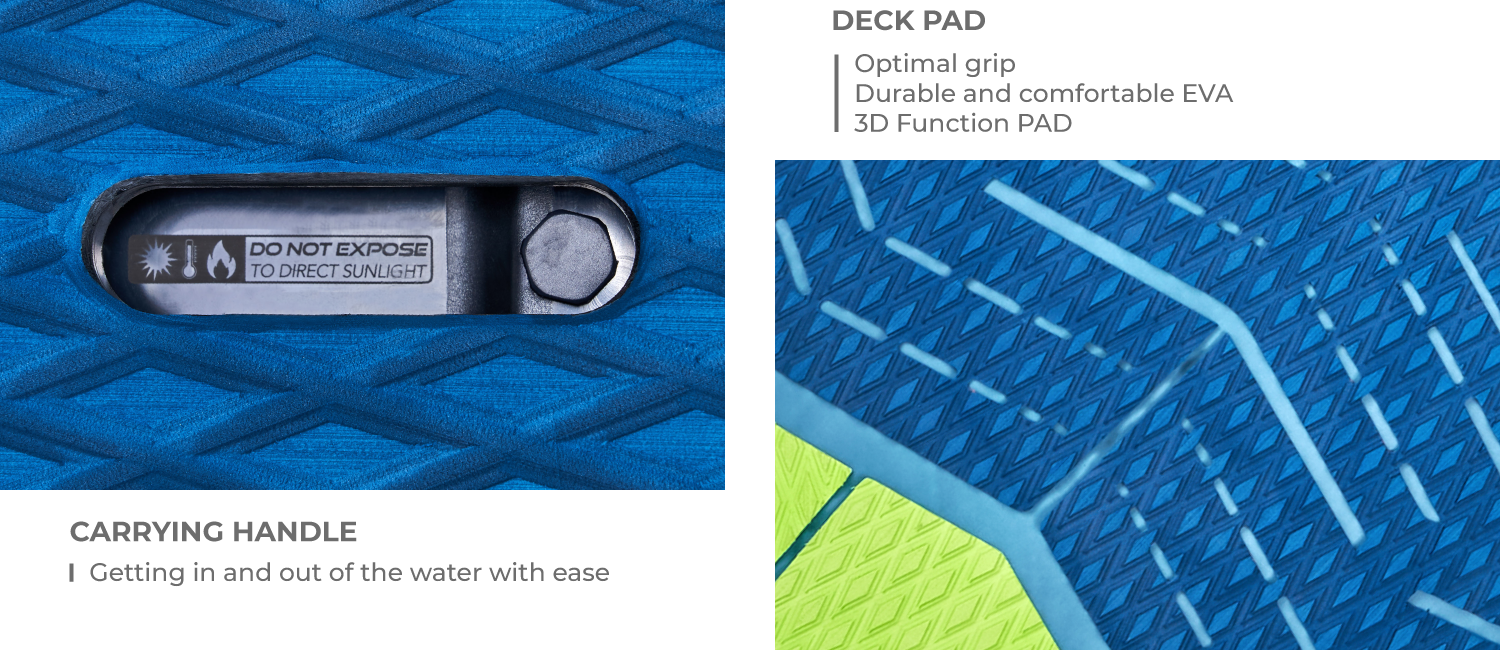 An ergonomic carrying handle on the deck makes it easy to handle the board out of the water. It also allows you to get the board out of the water with only one hand, which is handy!
