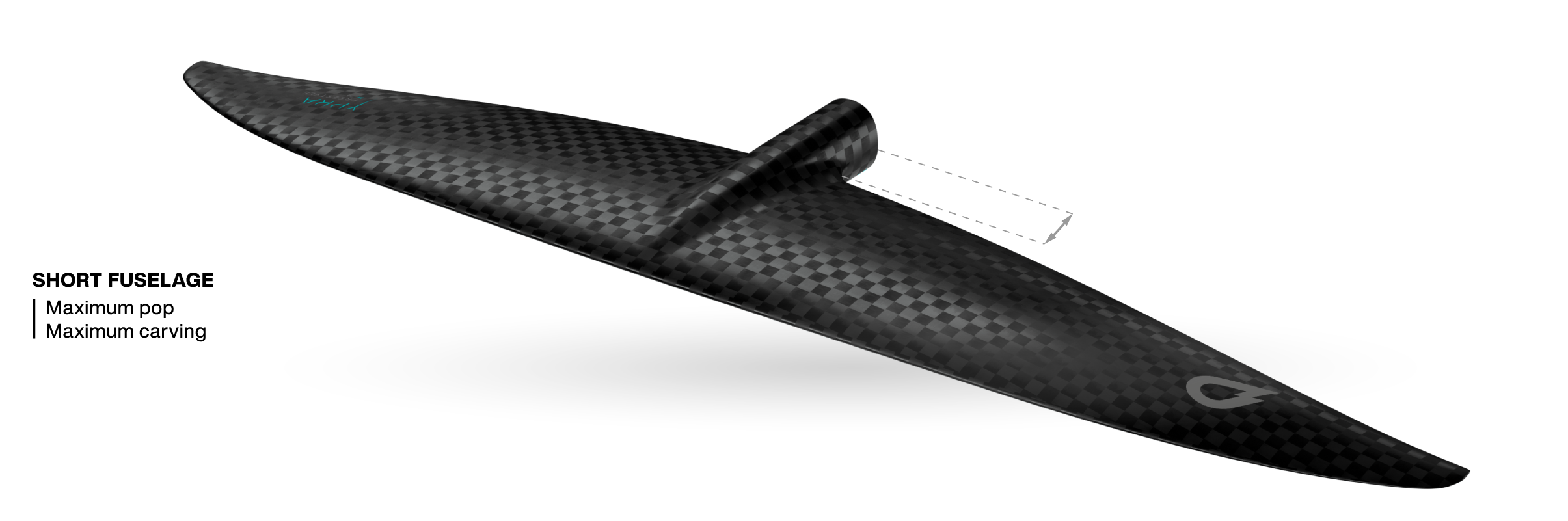 The fuselage is shorter than on the rest of the range to increase the foil's responsiveness, agility, and maneuverability. The goal is controlled instability via the front foot, allowing for a transition from stable flight to monstrous pop in a fraction of a second. Reducing the foil's front-to-back span is a key factor in achieving this pop.