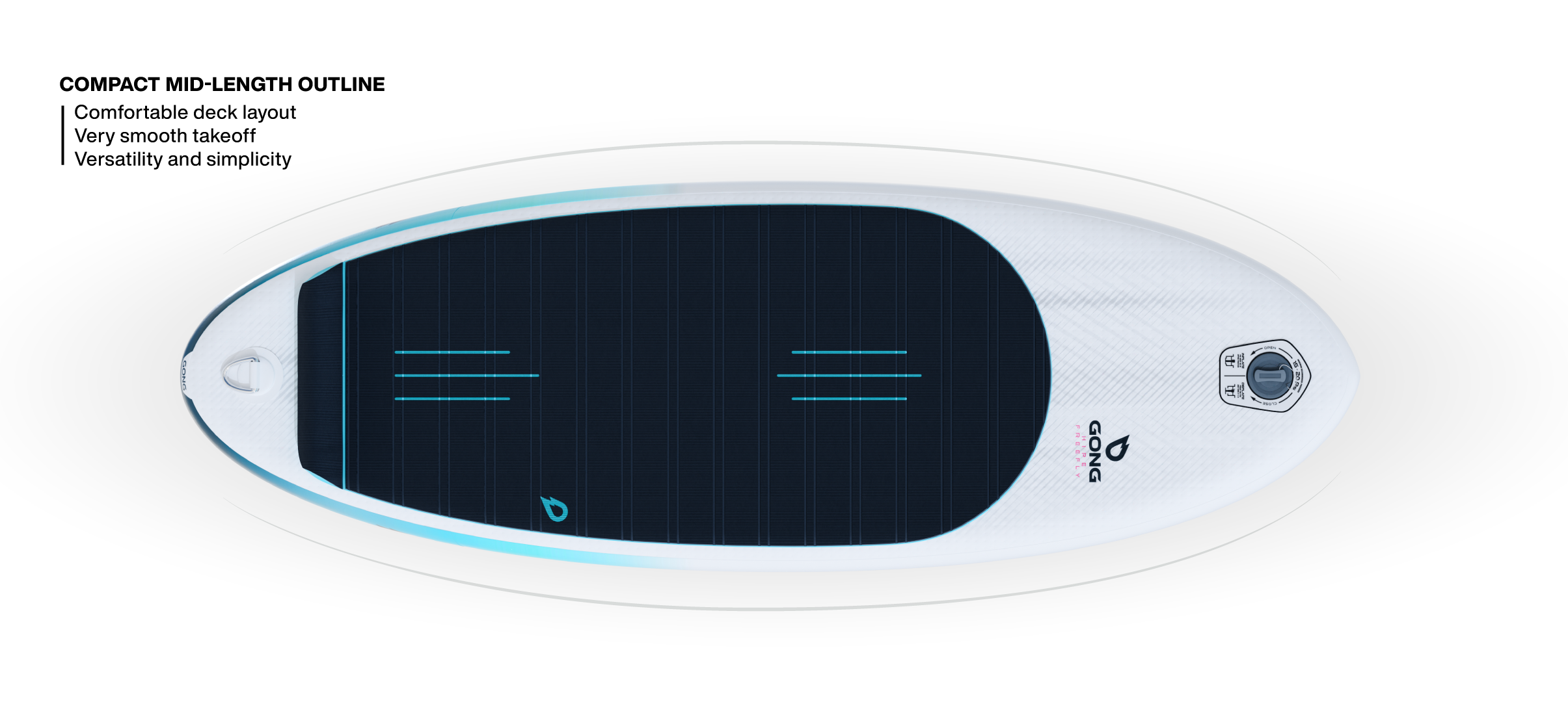To improve takeoff, our designers developed a rigid rail at the tail of the board, directly inspired by the sharp edge at the tail of rigid wing boards. This allows for a clean separation of the water flow at the end of the hull, resulting in better glide before takeoff and boosting acceleration.