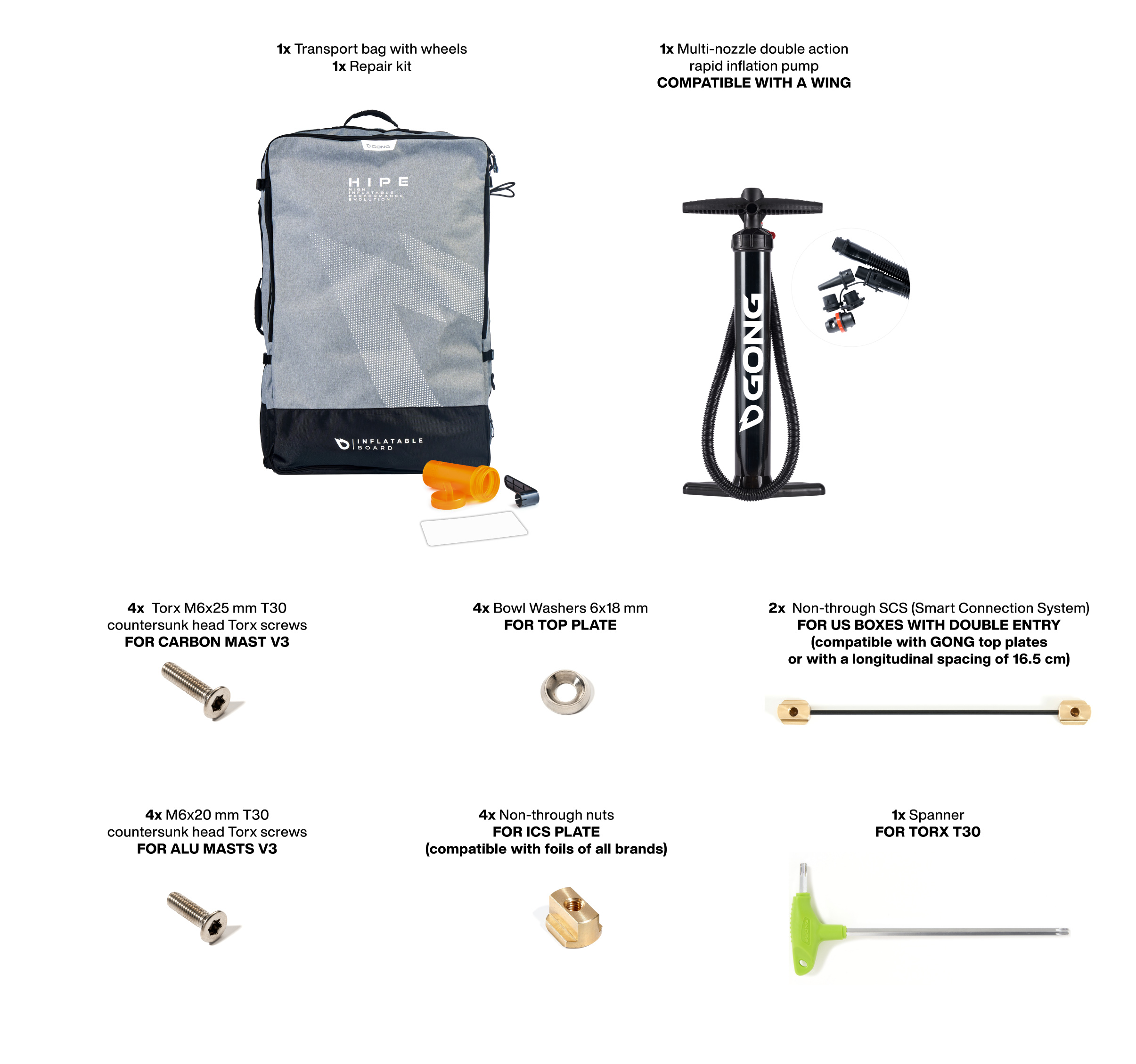 The composite plate is equipped with dual SCS (Smart Connection System) entry boxes for easy foil installation and adjustment. The double holes correspond to the stance of the holes on your GONG foil's mounting plate. The foil is presented with the squares already mounted on the plate, which slide into the rails without disassembly. Slide the foil in, tighten the four screws, and you're ready to ride.