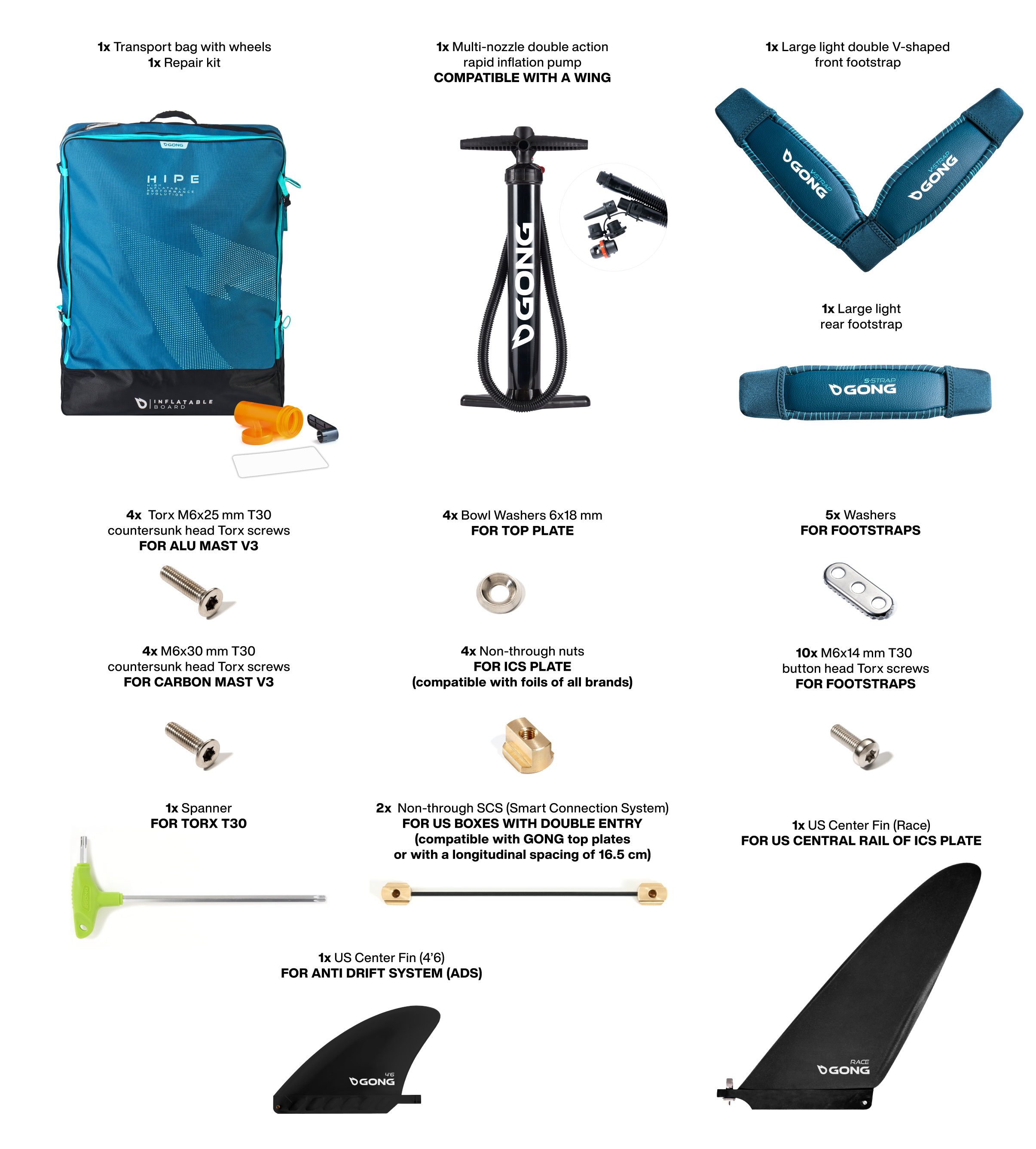 All the screws for the straps and the top plate of the foil are supplied with the board.