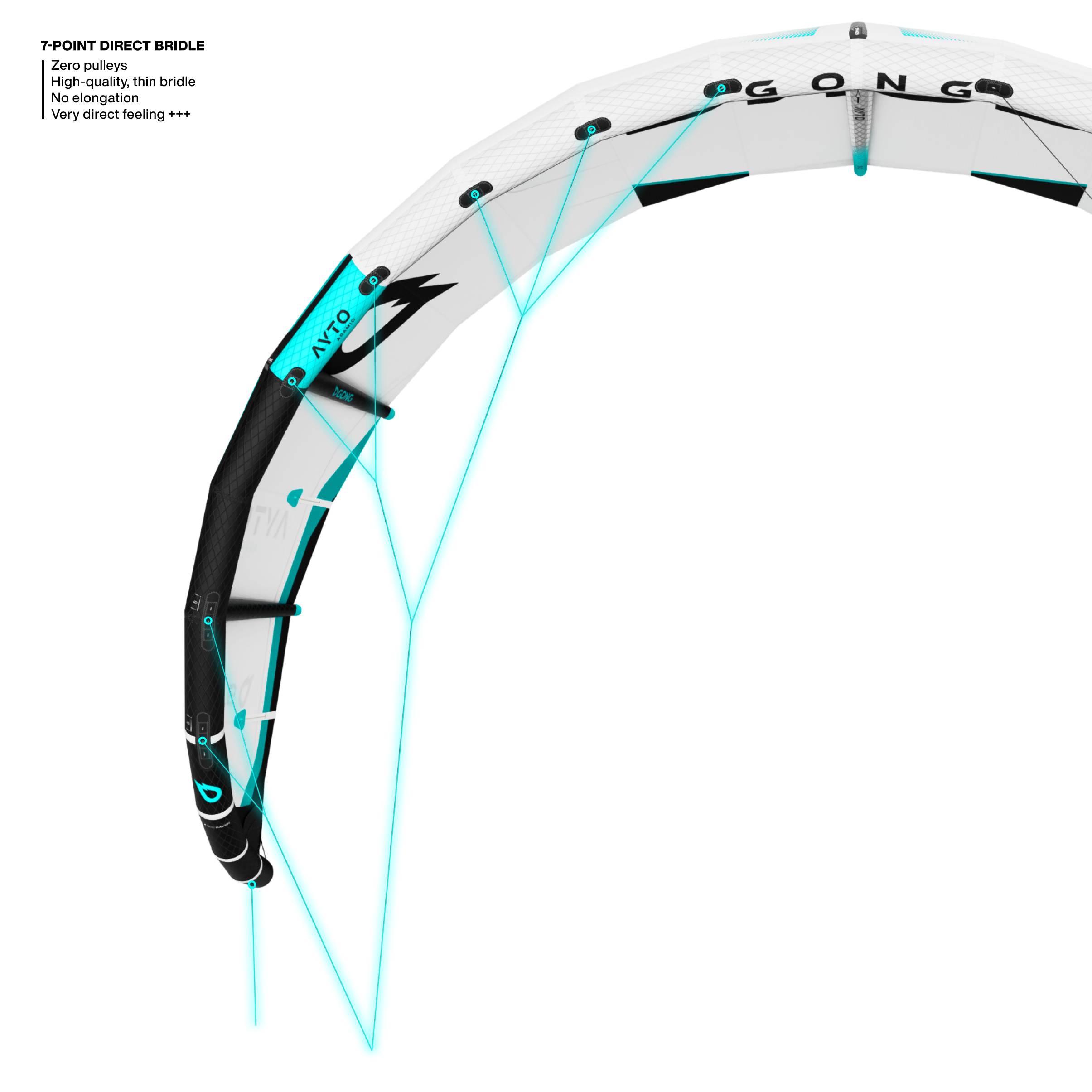 Short bridle lines to prevent tangling in the tips and make the kite more responsive; attached at 7 points, without pulleys for a hyper direct and uncompromising feel.