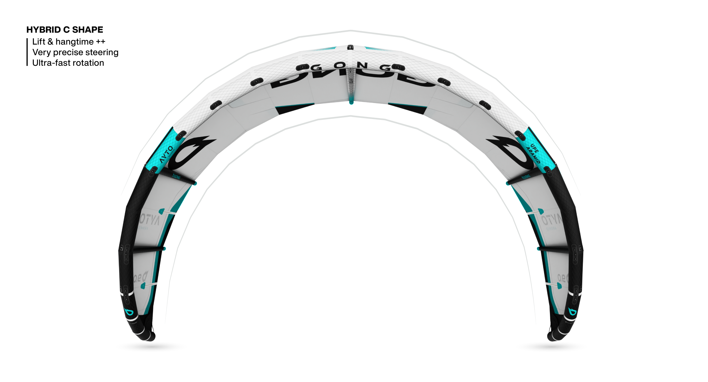The Ayto is a hybrid C shape designed to boost tension, precision, and rotation. A more open arc in 2026 and increased projection result in speed, upwind performance, lift, and perfect maneuverability at the heart of the kite for loops and megaloops.