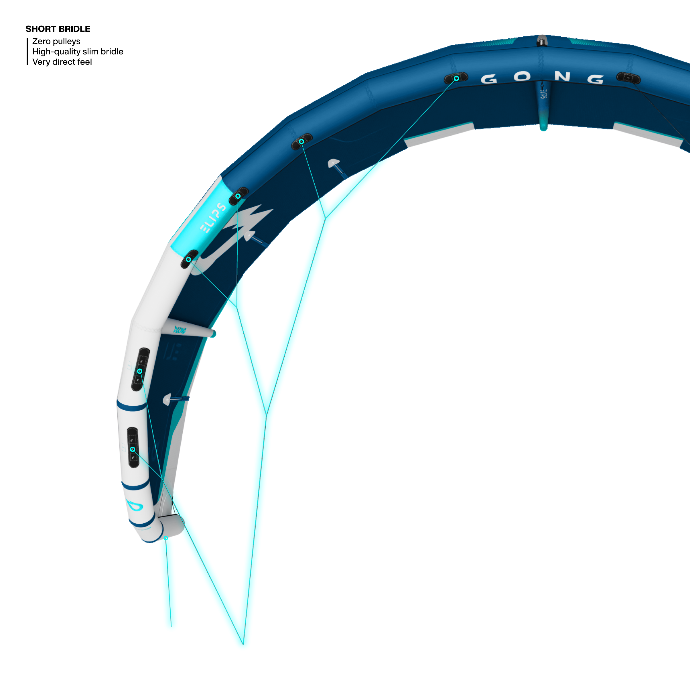 The new short bridle system improves feedback and the feel is much more direct. Combined with a pulley-free system, this results in a precise and fast kite.