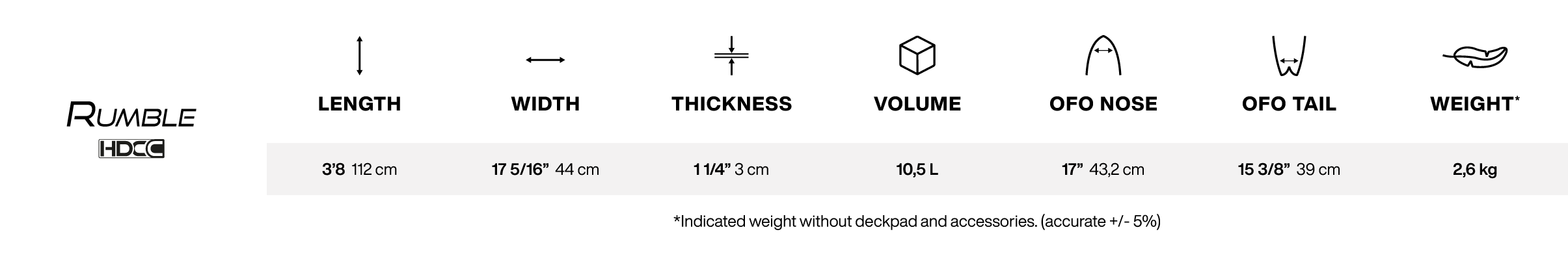 The Rumble HDCC comes with our new 5mm thick Ridge Traction pad. The grooved surface design ensures excellent grip. The pad is one continuous piece that covers the entire top surface, so there's no need to wax your board. It also eliminates small angles that could peel off over time.