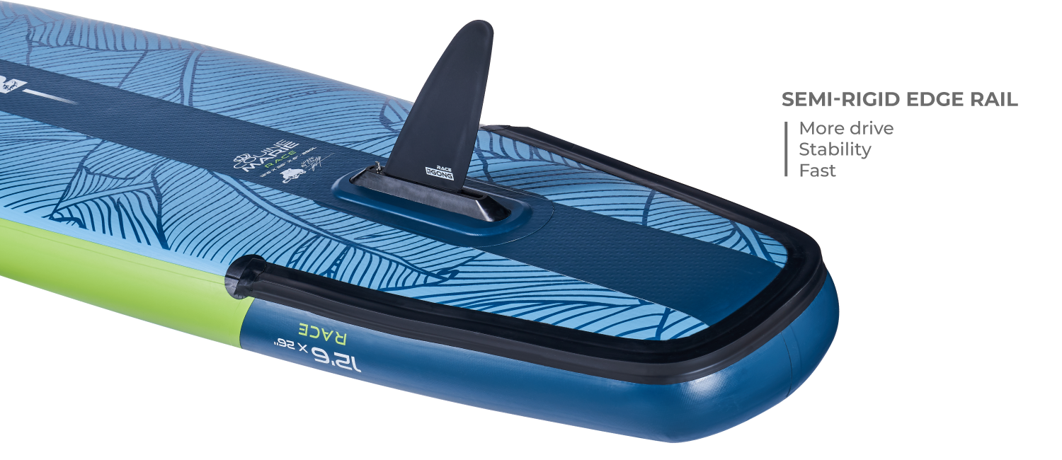 The semi-rigid rails at the tail form a ridge that precise handling and improves water outflow. We go faster and the steering is finer.