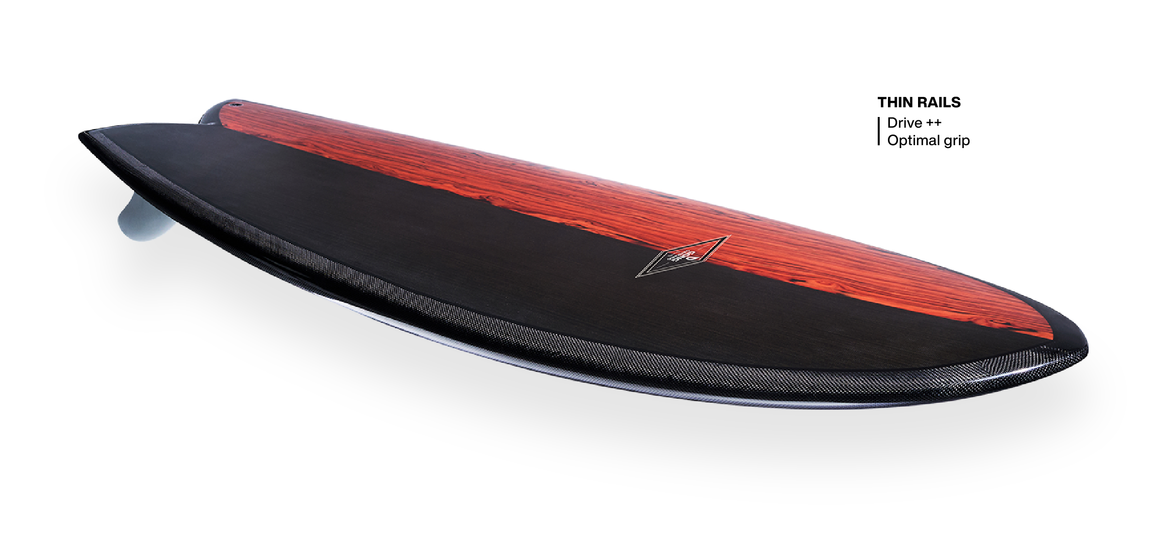 This volume on the front of the board disappears towards the tail to make way for very thin rails, making the handling very precise and the drive magical.