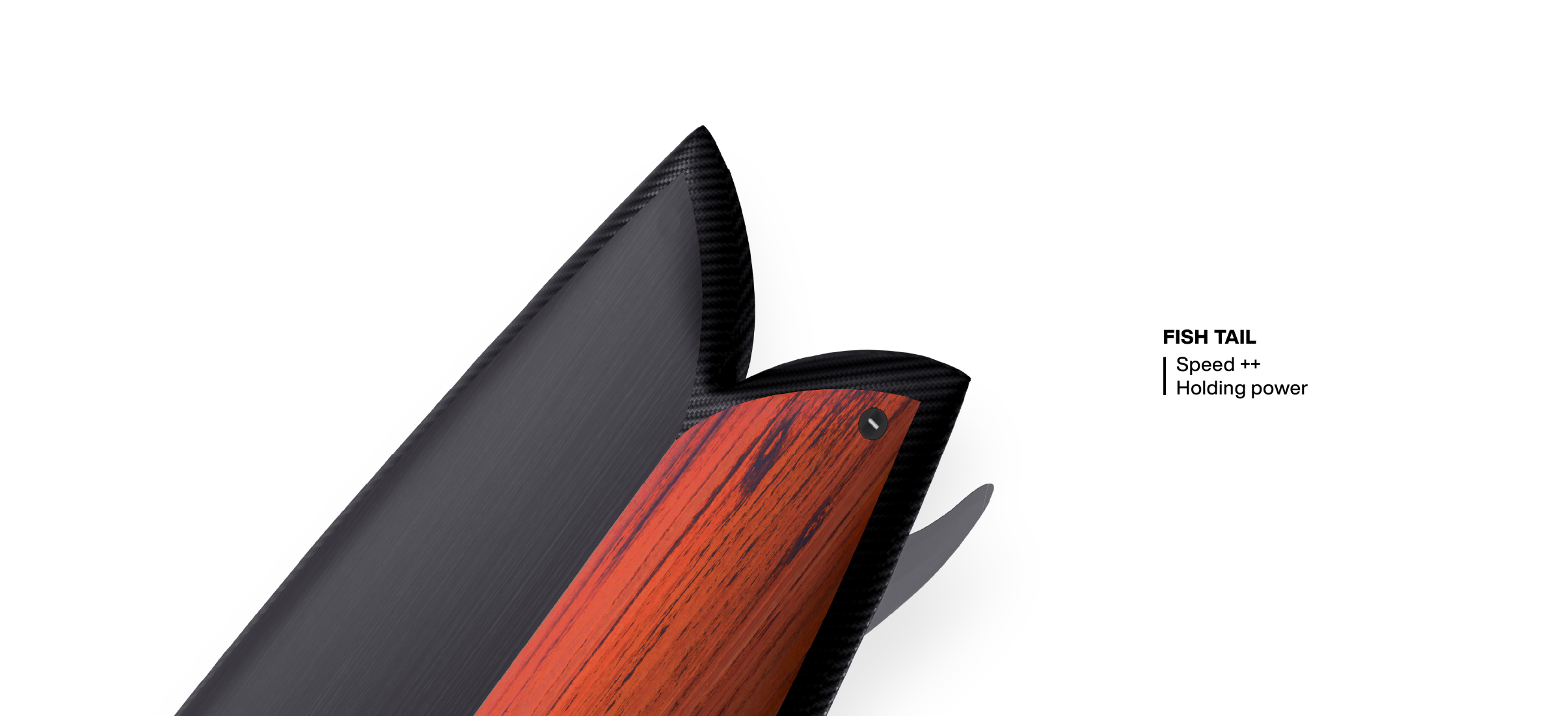 Wide and deep fish tail for early planing without sacrificing maneuverability and drive.