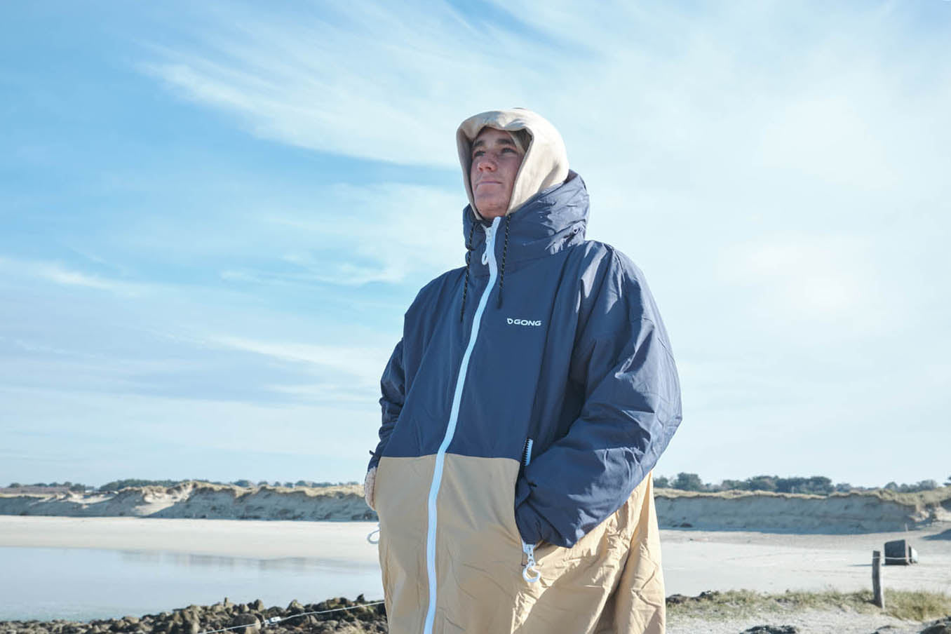 When exiting the water for a break, this waterproof poncho will keep you warm… . Its wide cut allows you to put it on without sticking to the wetsuit and to keep the harness underneath it.