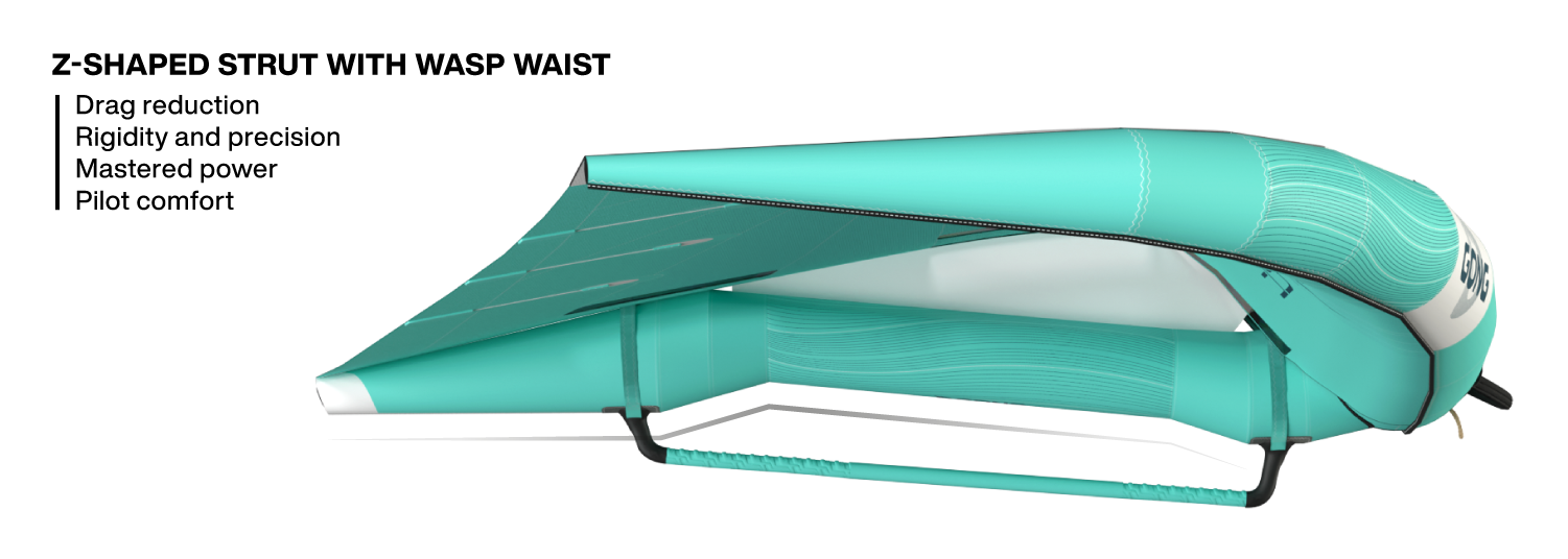 The rear hand acts directly on closing the trailing edge thanks to the placement of the boom's rear point after the beginning of this wide cone: by pulling on the rear hand, you close the strut instead of letting it open like on classic struts. This overall design reduces flapping and offers impressive power. The increased rigidity allows for fine control of the wing and provides consistency in its behavior.