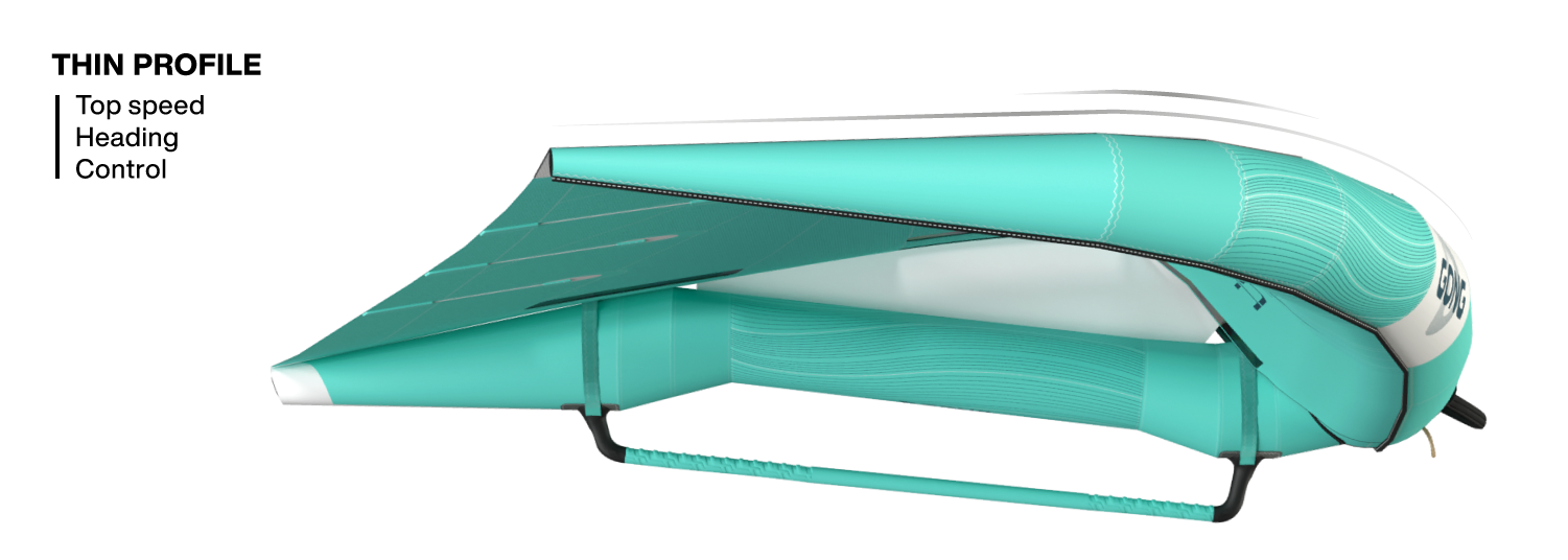 A wing that is extremely rigid, with a very locked draft and dynamic twist that acts like a real racing sail. You go very fast without effort, like a cambered windsurf sail, and you really feel the glide on long reaches.