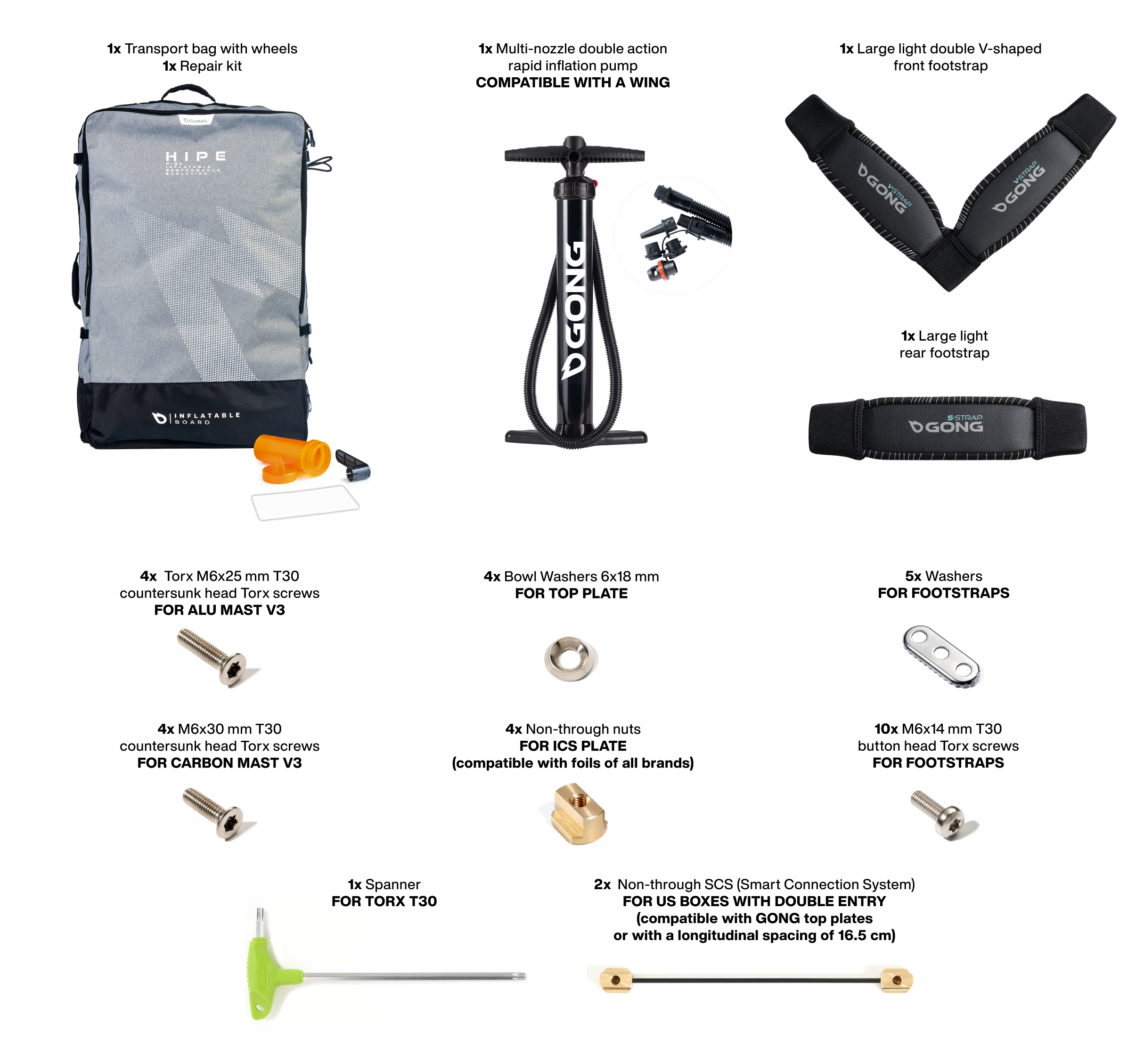 All the screws for the straps and the top plate of the foil are supplied with the board.
