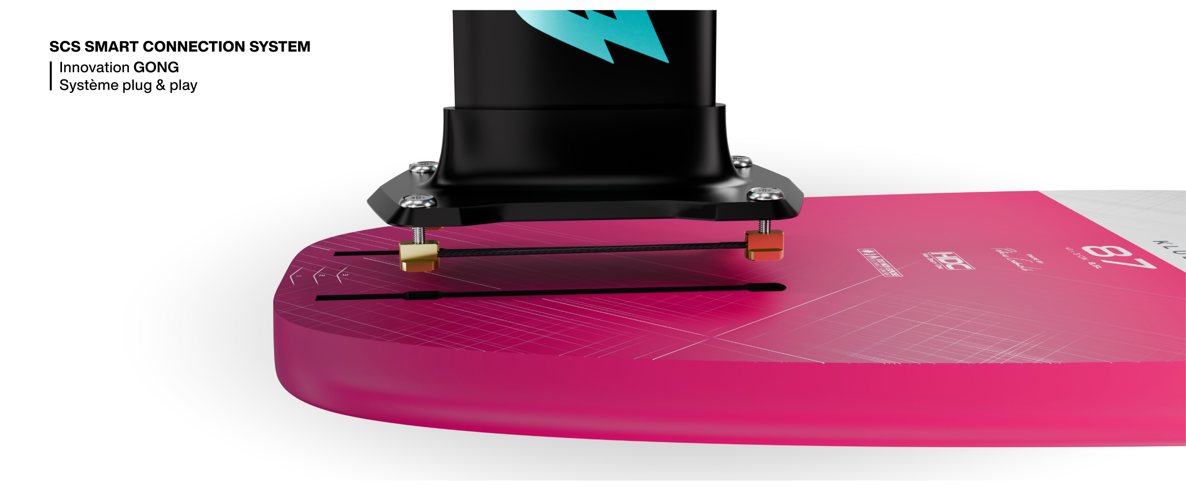 Avec les carrés SCS reliés par les tiges composites, vos carrés sont parfaitement alignés sans devoir y toucher. Vous les placez sur les 4 entrées, vous insérez, vous reculez à la position choisie et en deux tours de clefs par vis le foil est monté. Le box double entrée GONG facilite le montage et le réglage du foil ! La performance sans les soucis. Au démontage on laisse les carrés et les vis sur la platine, on desserre les vis, on retire le foil et c’est parti ! C’est la solution plug and play qui facilite les réglages (carrés SCS non fournis avec la planche).