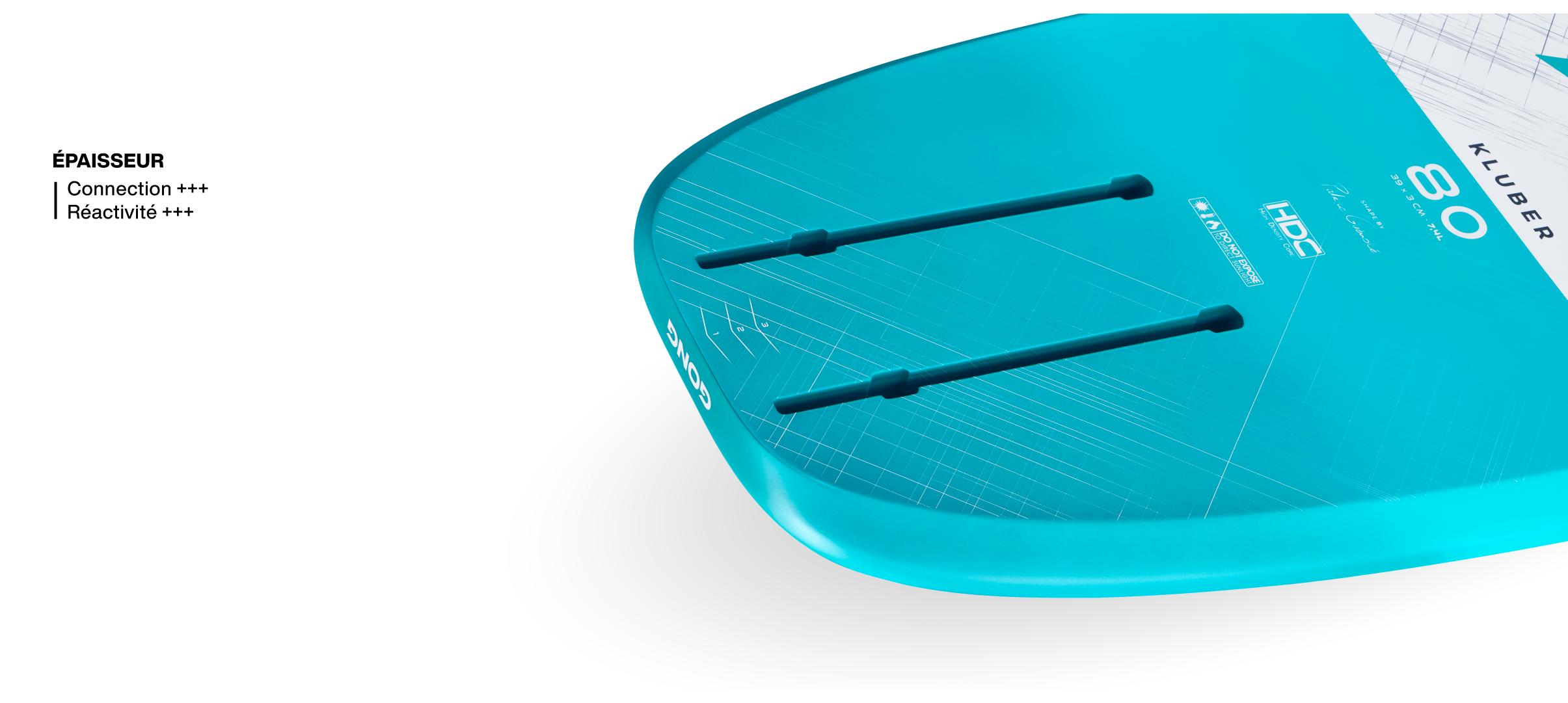 Avec un rocker très tendu, le pumping est plus efficace et offre une assiette parfaite pour faciliter et optimiser chaque appui, pied avant bien à plat sur le deck. Il permet également l’utilisation de toute la longueur de la Kluber en fonction de son gabarit et de son stance.