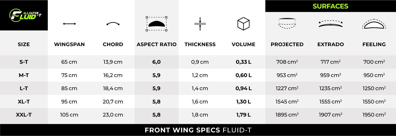 La déclinaison nommée T est une version haut ratio de la Fluid : encore plus de vitesse car l’outline est étiré dans son envergure, et l’épaisseur du profil est diminuée. La gamme Fluid T conserve sa maniabilité et sa portance à basse vitesse, mais se fait plus rageuse pour satisfaire les experts.