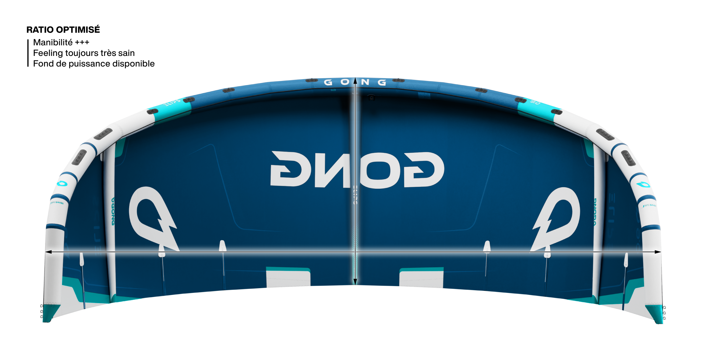 Tips carrées, plus ouvertes et de surface modérée : elles libèrent le kite en rotation et donnent une maniabilité énorme. Le vrillage de la Elips ferme la tip interne à la courbe et ouvre l’opposée franchement pour tourner encore plus vite sur l’oreille. On peut faire tourner le kite sur place ou le faire sortir de la fenêtre selon l’action sur la barre, ce qui est idéal en surf et en strapless freestyle.