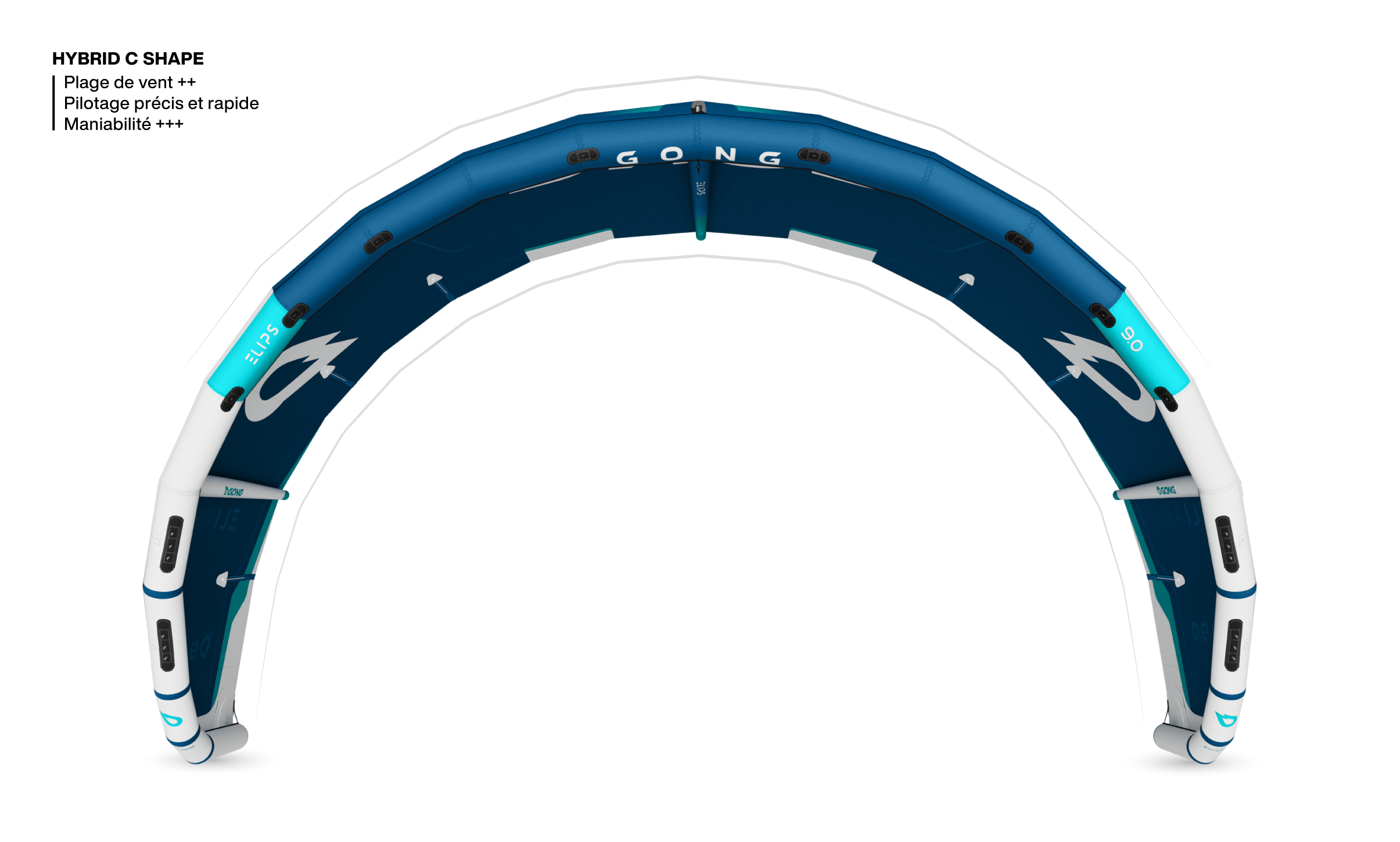 Shape “autostable” avec son ratio intermédiaire, sa surface centrée et son creux important qui accroche l’air. Les tips légèrement reculées répartissent la masse vers l’arrière pour éviter les piqués / décrochages. On a en mains un kite prévisible et très sain pour un maximum de liberté.