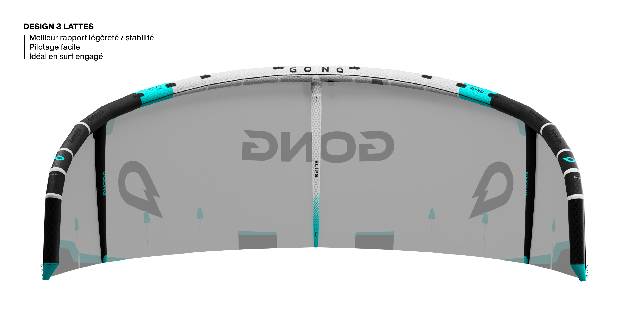 - Design 3 lattes : excellent compromis poids / stabilité pour d’excellentes performances en surf, en restant simple et sain à piloter. Les 3 lattes donnent une très bonne réactivité tout en conservant une tenue de profil exemplaire en plage haute.