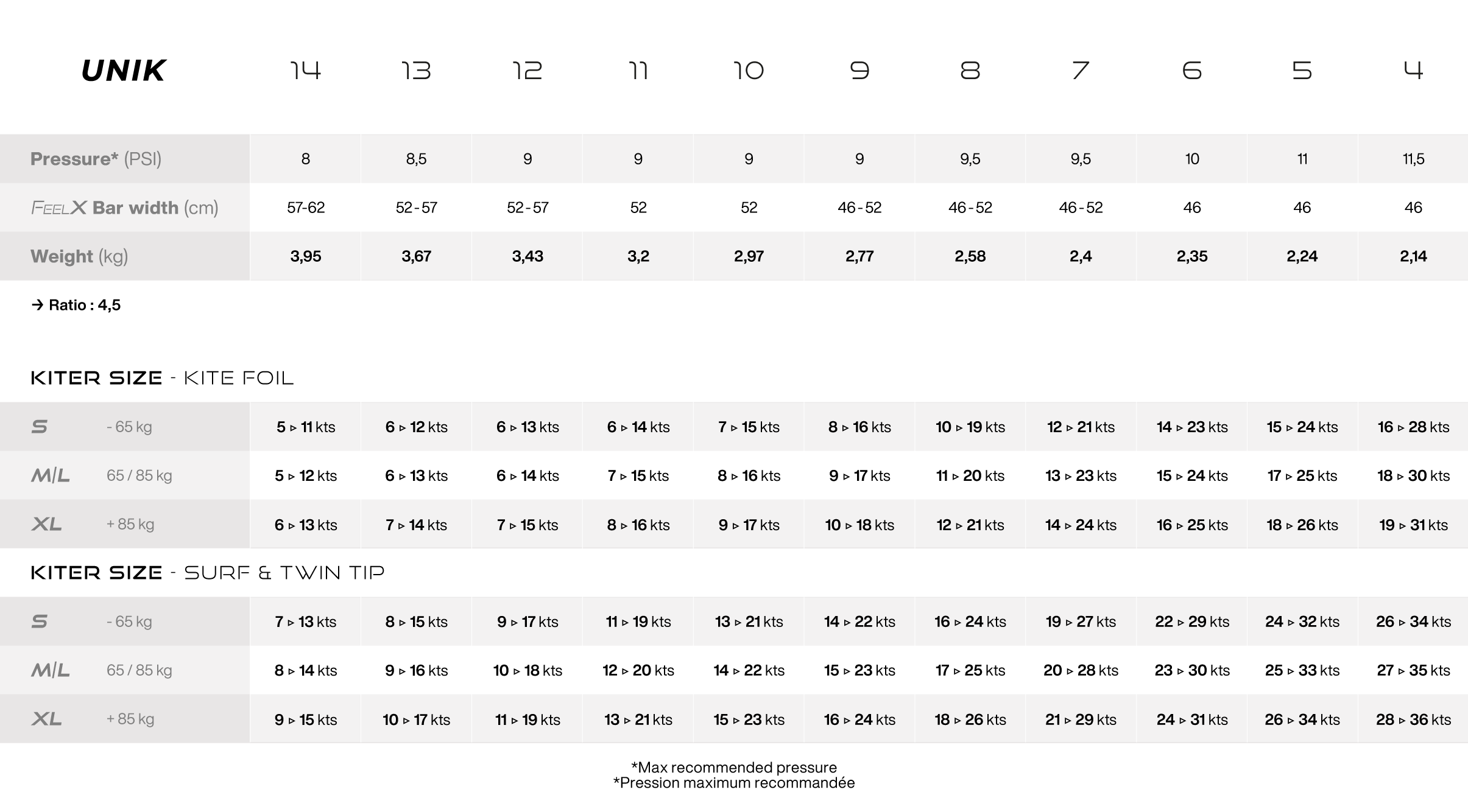 Ratio augmenté passant de 4,3 à 4,5, apportant un vrai gain de finesse et de vitesse. L’aile traverse la fenêtre plus rapidement, remonte mieux au vent et offre un appui plus réactif en lightwind. Elle devient plus dynamique tout en conservant le feeling très sain qui caractérise la Unik. Ce ratio supérieur améliore également la portance en saut dans le vent léger : les pops sont plus propres, la courbe de sustentation est améliorée et les réceptions plus fluides.