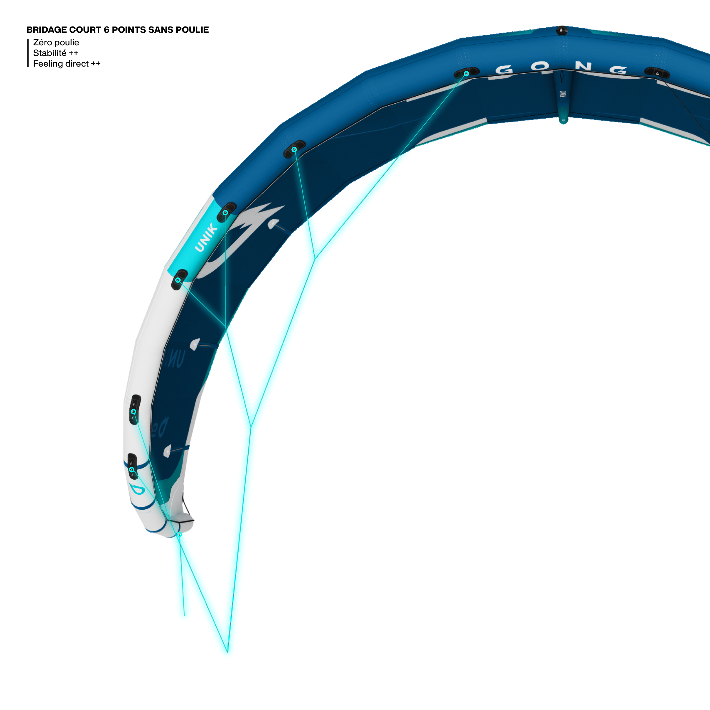 Bridage 6 points sans poulies transforme la précision en barre. La triangulation isométrique répartit les tensions de manière uniforme sur tout l’arc, ce qui rend le kite très calé, très constant et extrêmement stable dans les rafales comme dans les vents asthmatiques. Le pilotage devient beaucoup plus direct, sans latence, avec une traction très régulière qui sécurise le rider notamment en foil et en surf.