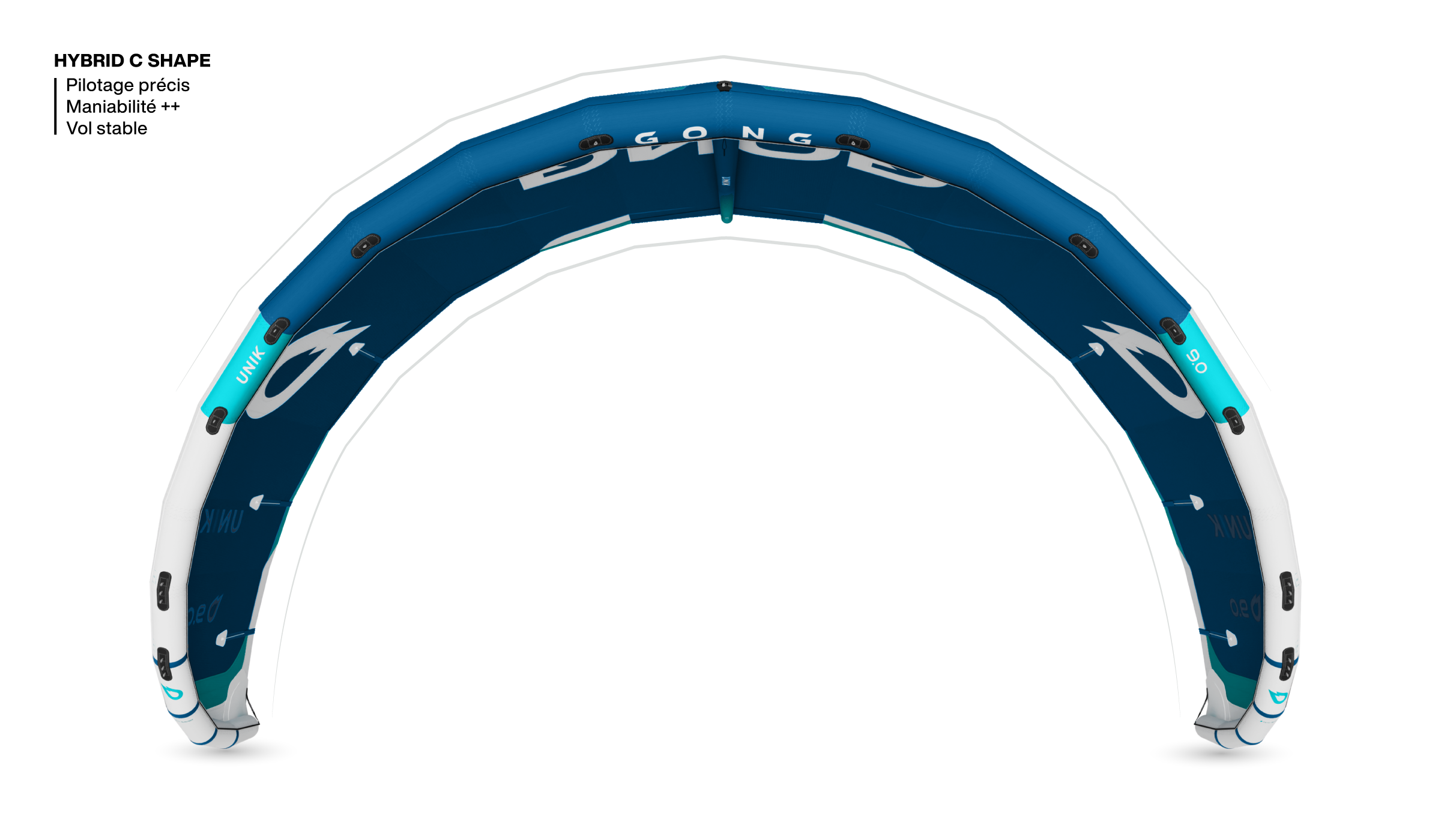 Hybrid C shape : design moderne, stable, dynamique et prédictible. La projection augmente nettement (de 65% à 68 %), combinée à un arc beaucoup plus ouvert : plus de glisse, plus de surface utile au coeur de l’aile, un vol encore plus fiable, plus de power pour de meilleures performances dans le vent léger. Le rayon de rotation reste réduit : la Unik tourne super bien, avec un retour d’info hyper clean en barre.