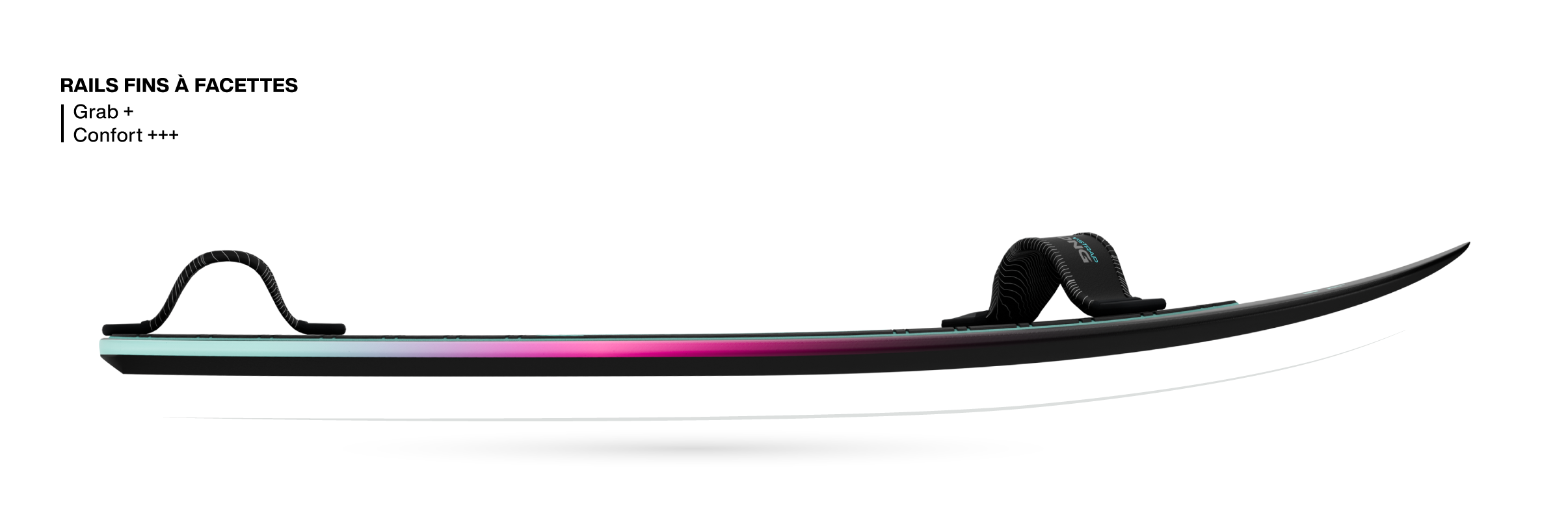 Large rounded square nose pour avoir plus de surface de pied avant, avec un double concave très marqué en dessous qui facilite la gestion des touchettes dans le clapot même avec beaucoup d’angle. Il apporte également un renfort de rigidité.