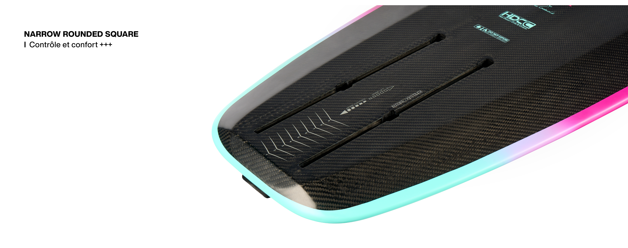 La construction HDCC 100 % carbone intégrant les box donne à la Rumble une rigidité extrême et une solidité maximale. Le contact pieds/foil est direct, précis et instinctif. Chaque impulsion est retransmise sans perte, amplifiant les sensations et la créativité.
