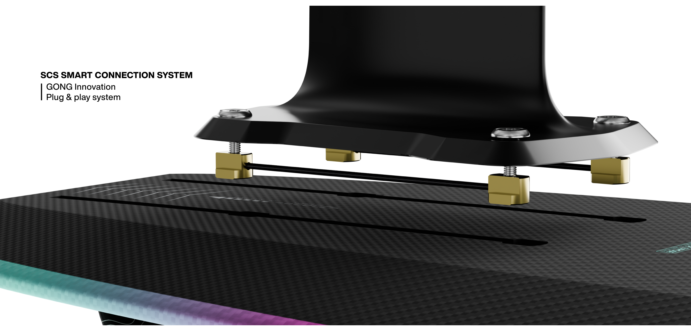 Avec les carrés SCS* reliés par les tiges composites, vos carrés sont parfaitement alignés sans devoir y toucher. Vous les placez sur les 4 entrées, vous insérez, vous reculez à la position choisie et en deux tours de clefs par vis le foil est monté. Le box double entrée GONG facilite le montage et le réglage du foil !