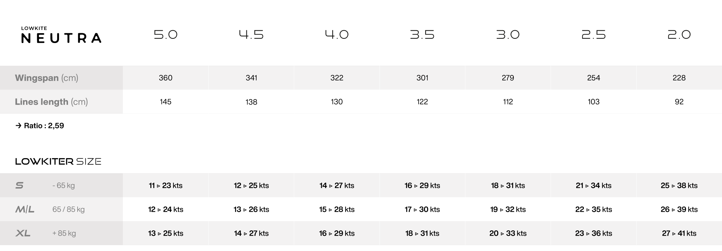 Le lowkite Neutra est disponible en 2m², 2,5m², 3m²,3,5m²,4m²,4,5m² et 5m². Le choix de la taille dépend principalement du gabarit du rider et des conditions de vent :