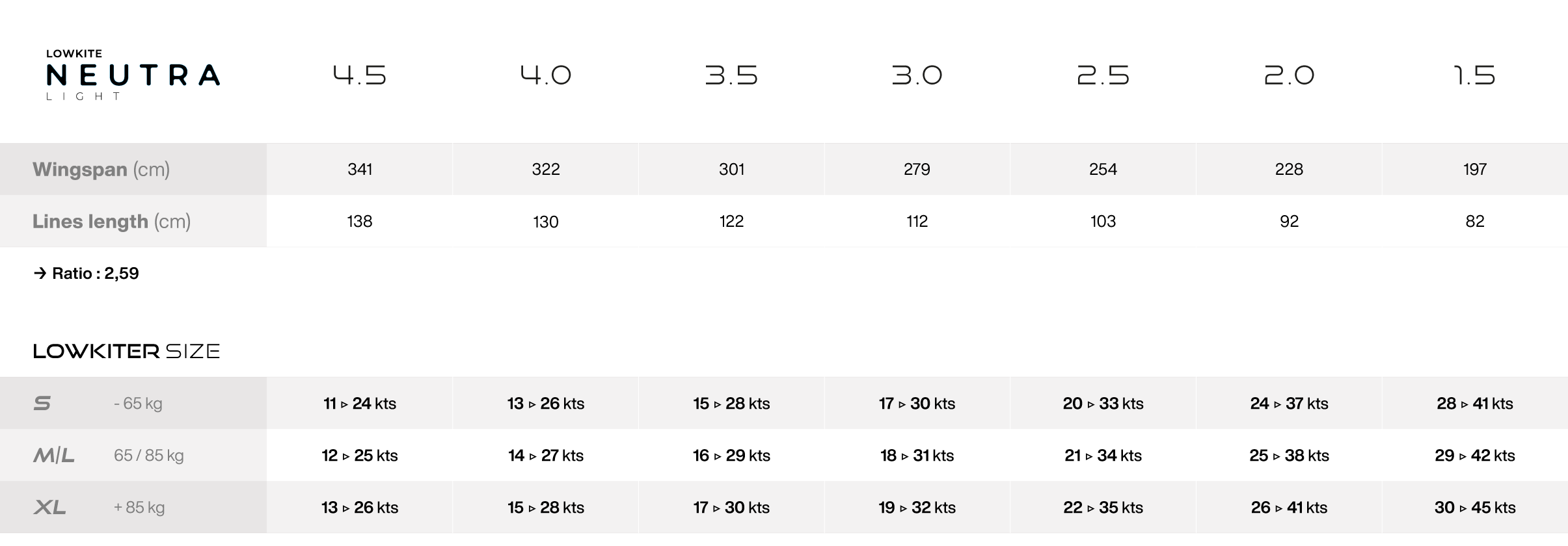 Le lowkite Neutra est disponible en 1,5m², 2m², 2,5m², 3m²,3,5m²,4m et 4,5m²Le choix de la taille dépend principalement du gabarit du rider et des conditions de vent :
