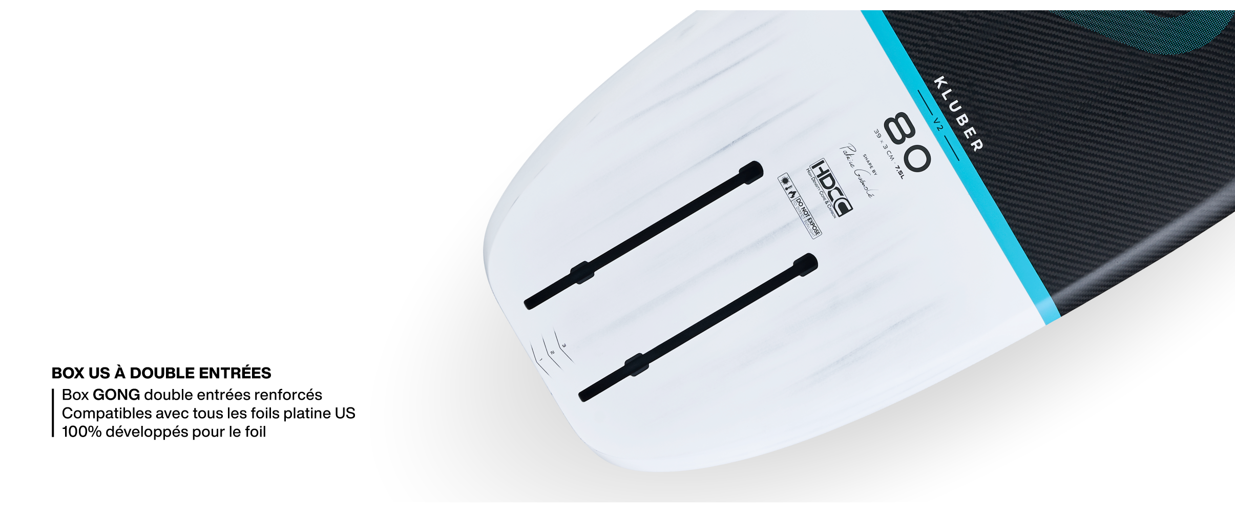 La Kluber est équipée avec notre système de box US à doubles entrées pour accueillir le SCS lancé sur toutes nos boards de foil récentes. C’est tellement facile d’installer son foil avec ce système que vous allez gagner du temps sur l’eau.