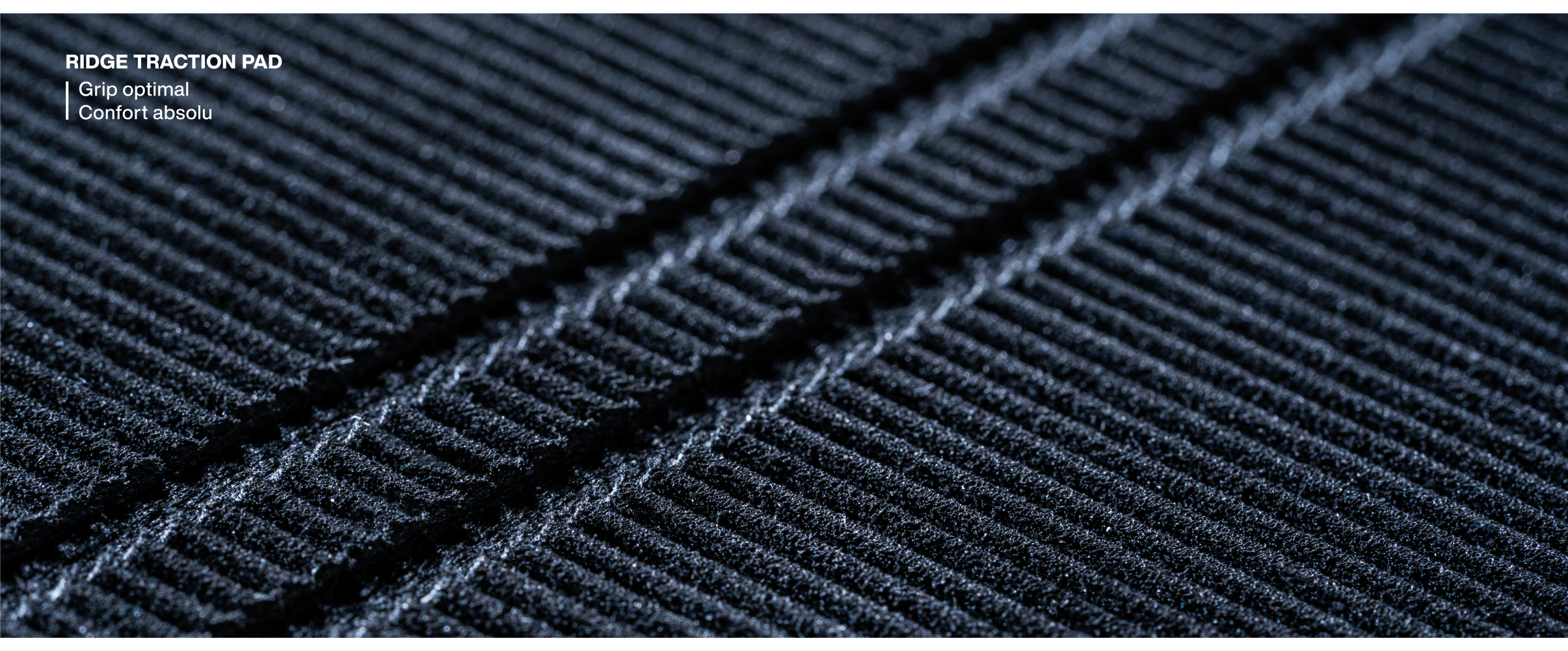 Sous les pieds, on retrouve le Ridge Traction Pad 3 mm : fin, hyper efficace, confortable, et surtout sans “flou”. Ça garde un retour d’info propre, uniforme, précis. Tu sais exactement où tu charges, et la board renvoie immédiatement.