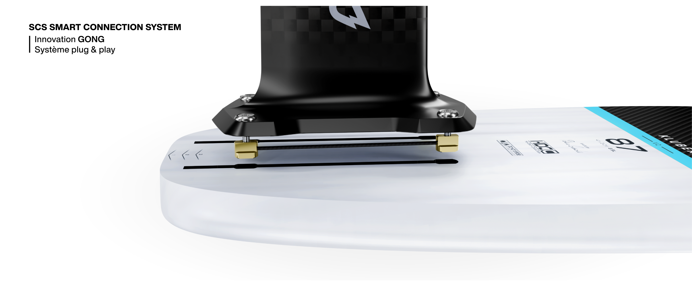 Avec les carrés SCS reliés par les tiges composites, vos carrés sont parfaitement alignés sans devoir y toucher. Vous les placez sur les 4 entrées, vous insérez, vous reculez à la position choisie et en deux tours de clefs par vis le foil est monté. Le box double entrée GONG facilite le montage et le réglage du foil ! La performance sans les soucis. Au démontage on laisse les carrés et les vis sur la platine, on desserre les vis, on retire le foil et c’est parti ! C’est la solution plug and play qui facilite les réglages (carrés SCS non fournis avec la planche).